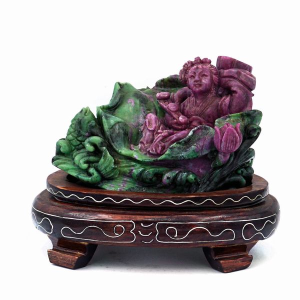 manifattura orientale, XIX-XX Sec. raffigurante una figura femminile contornata da elementi vegetali e floreali, base in legno