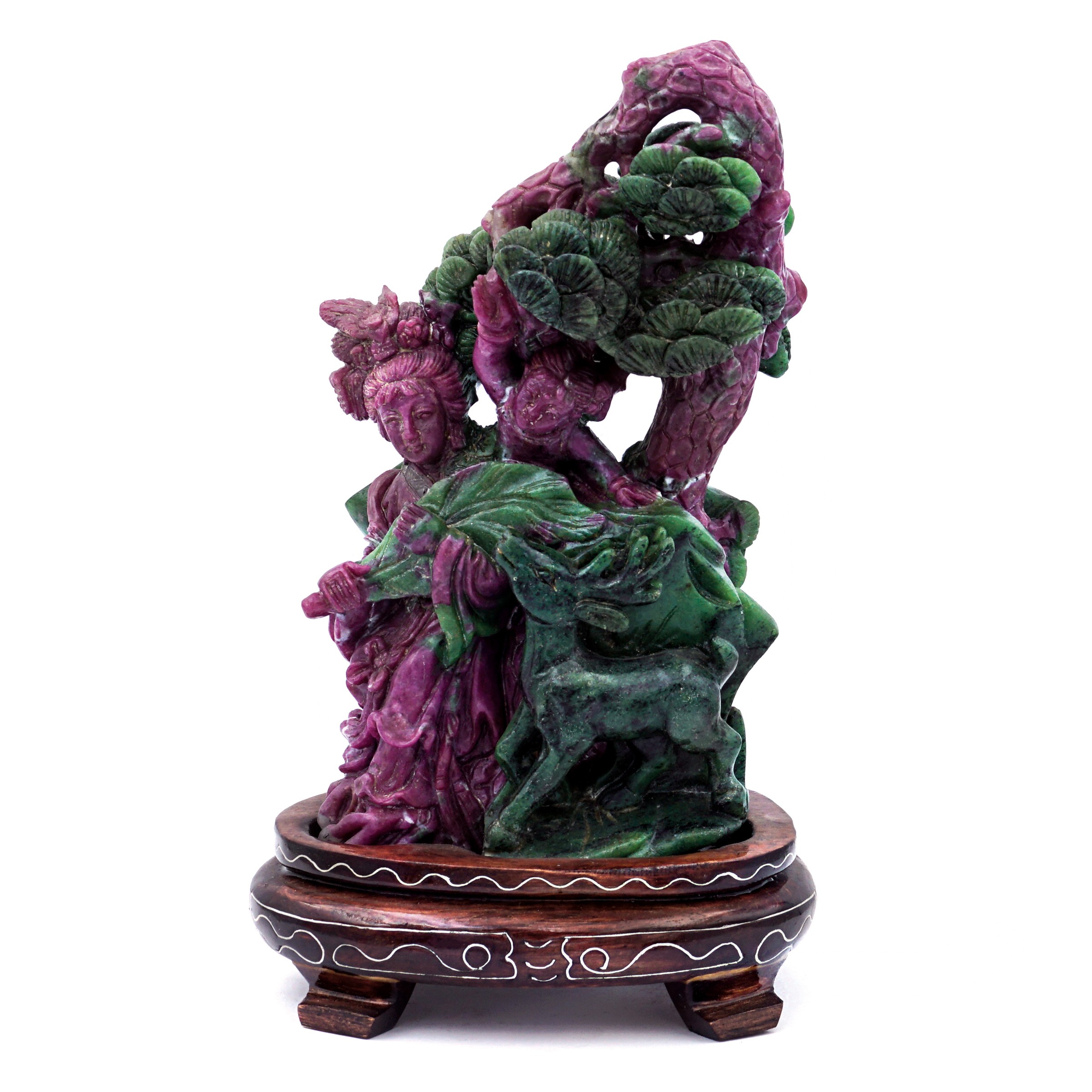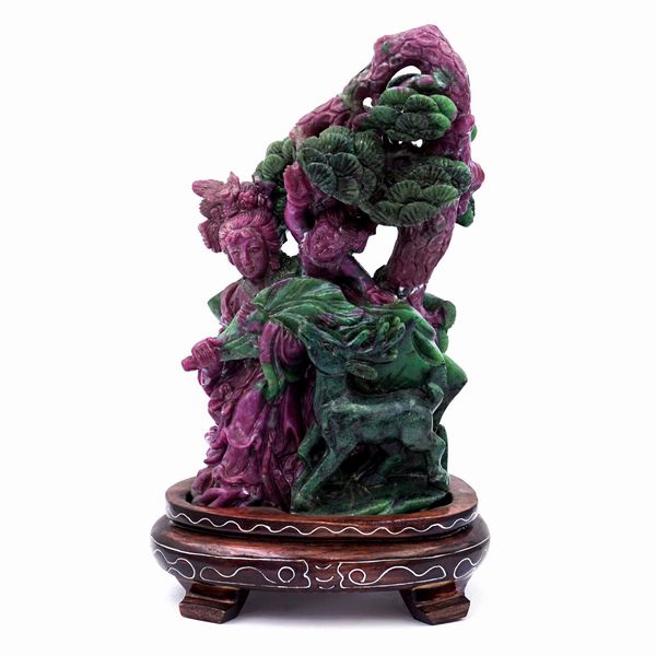 manifattura orientale, XIX-XX Sec. raffigurante una coppia di personaggi con cervo ed elementi vegetali, base in legno