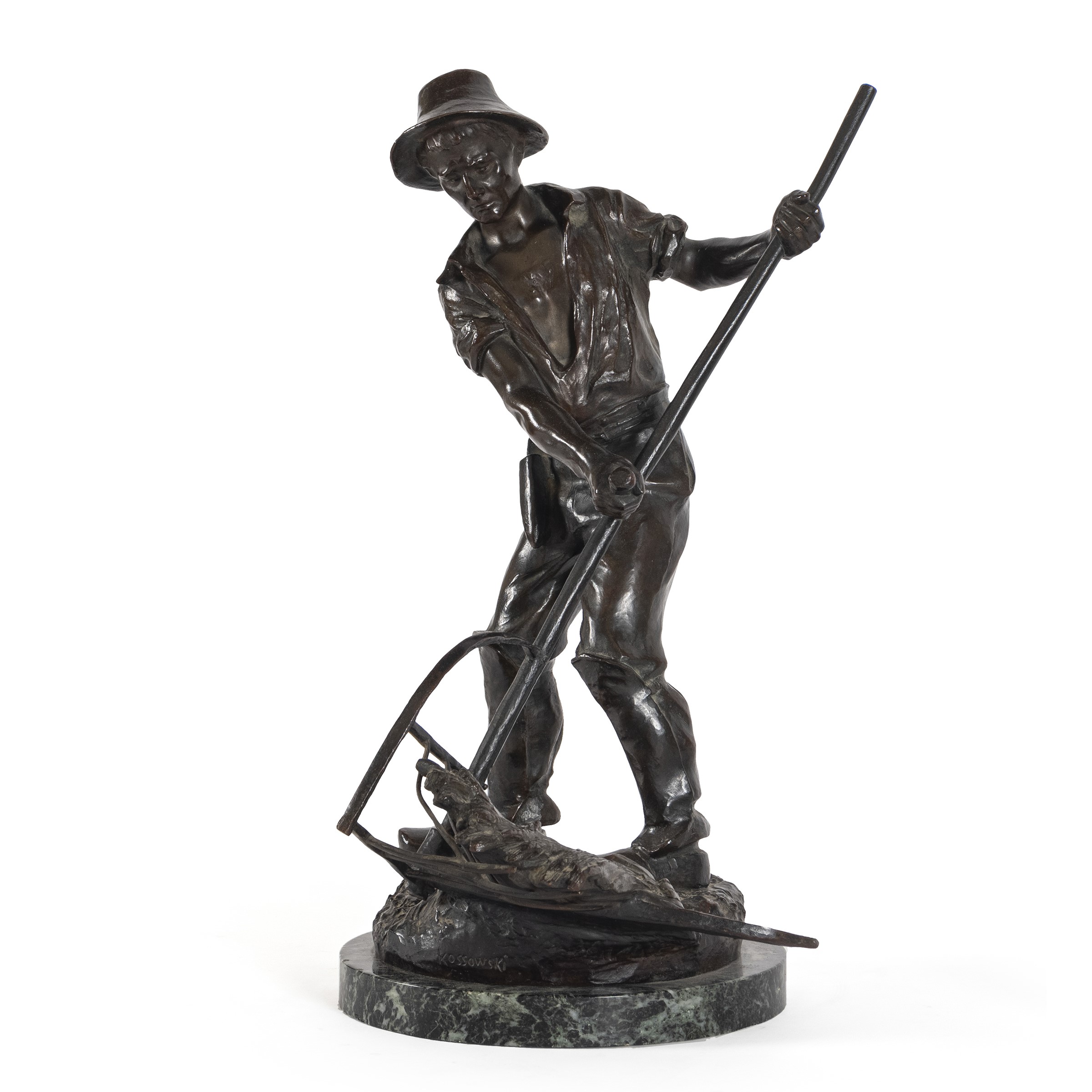 1855-1921 scultura in bronzo brunito raffigurante un mietitore, poggiante su base circolare in marmo verde, firmata in basso
