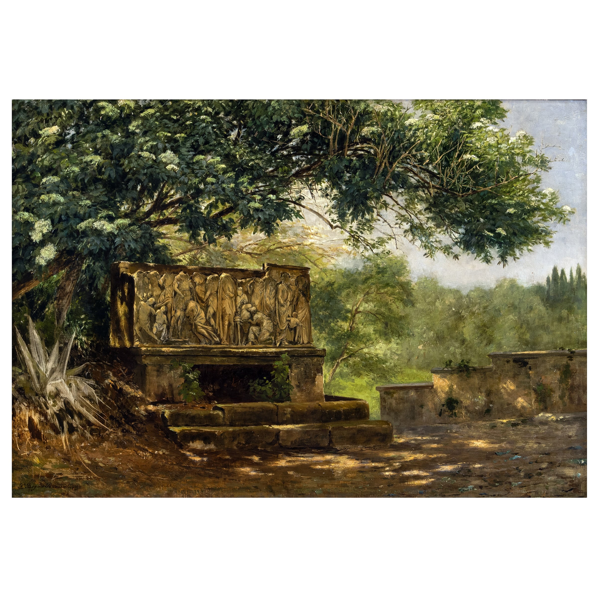 Vienna 1843 - Berlino 1910 Sarcofago romano sulla via Appia, olio su tela, firmato in basso a sinistra, entro cornice