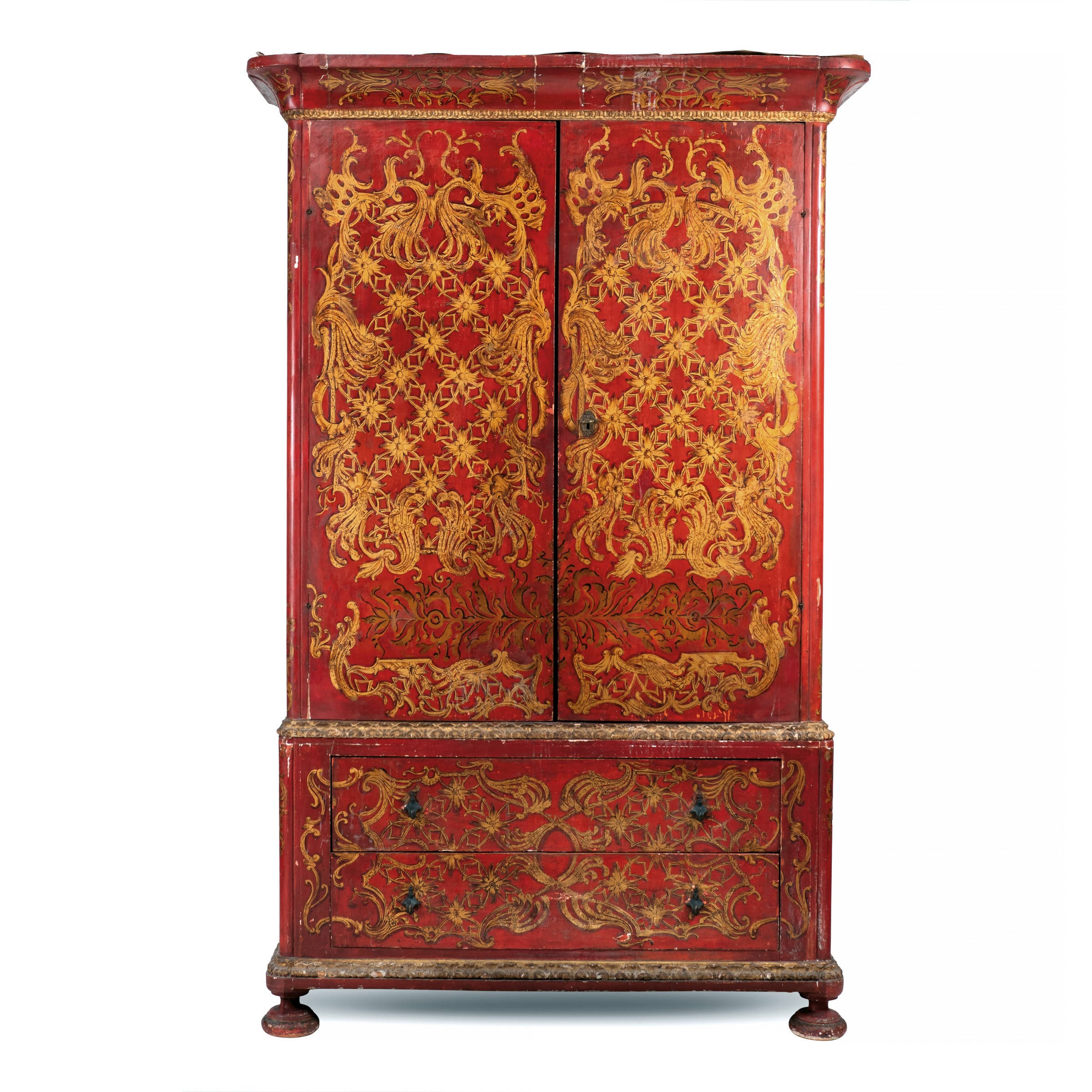 210x125x52 cm. Venezia, XVIII Sec. decorato in oro con motivi floreali e vegetali, profili in legno intagliato e dorato, parte superiore a due sportelli con all'interno ripiani, parte inferiore a due cassetti con maniglie in bronzo brunito e piedini a cipolla, difetti