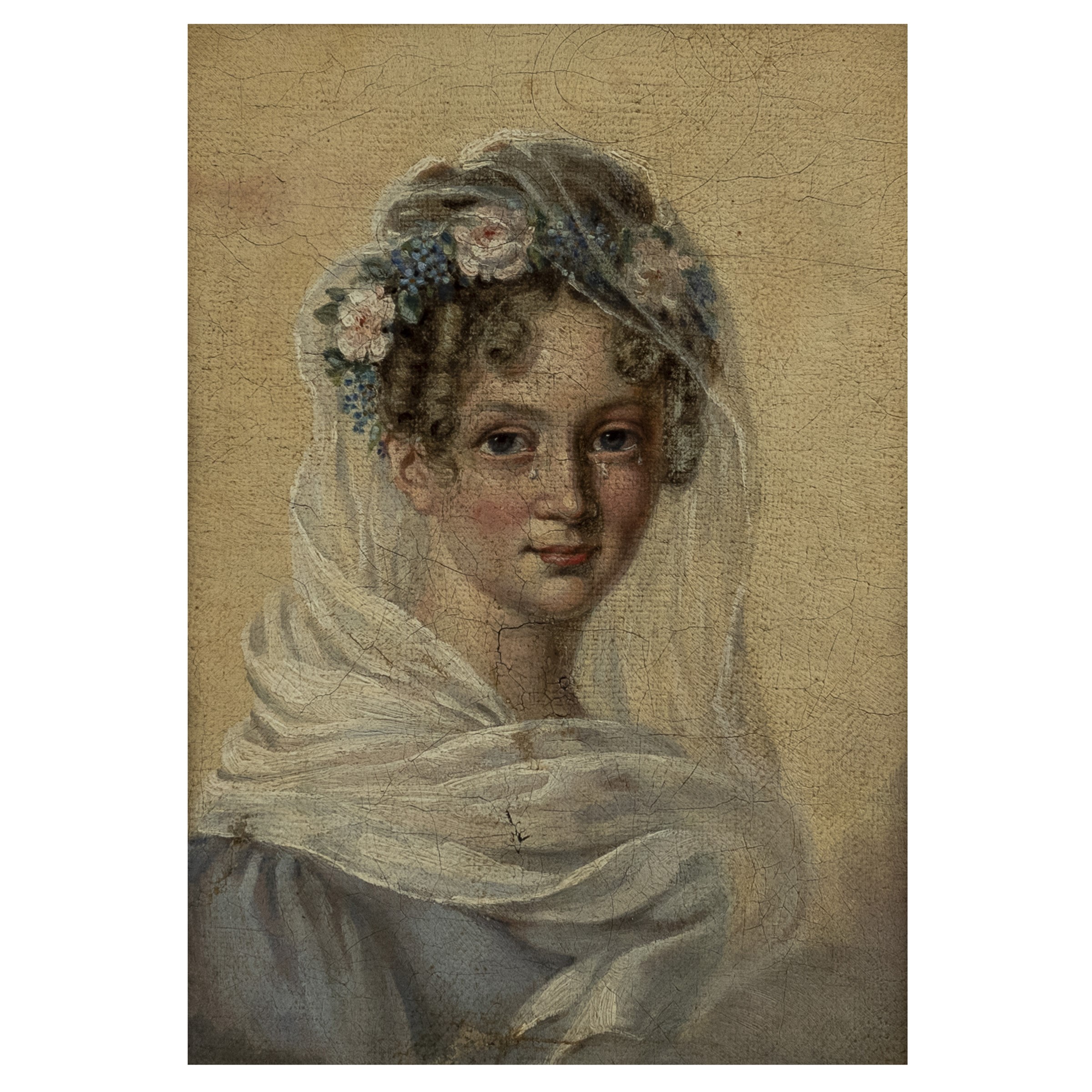 XIX Sec. Ritratto di donna con velo, olio su tela, entro cornice