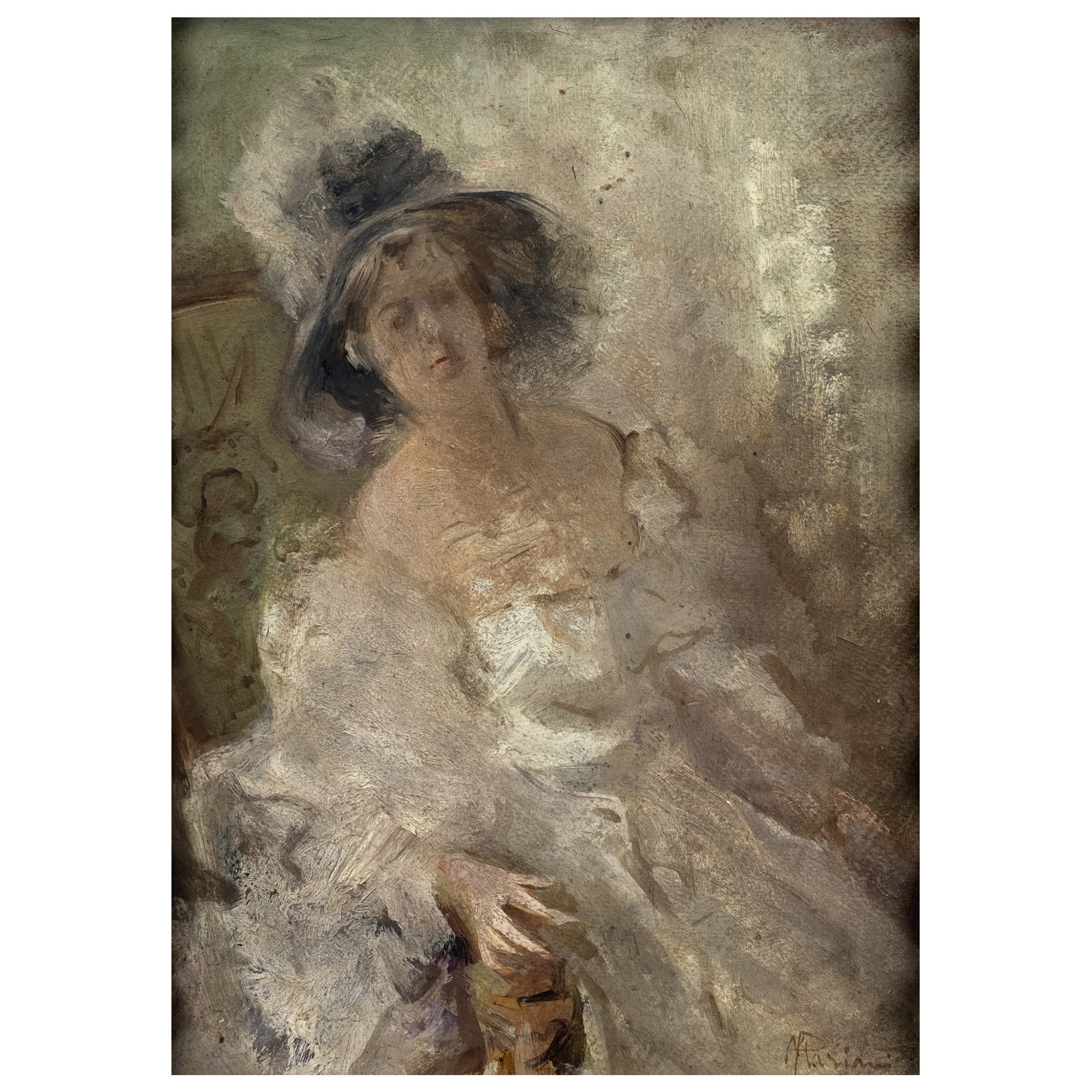Monza 1857 - Bordighera 1927 Ritratto di donna in poltrona, olio su cartone, firmato in basso a destra, entro cornice