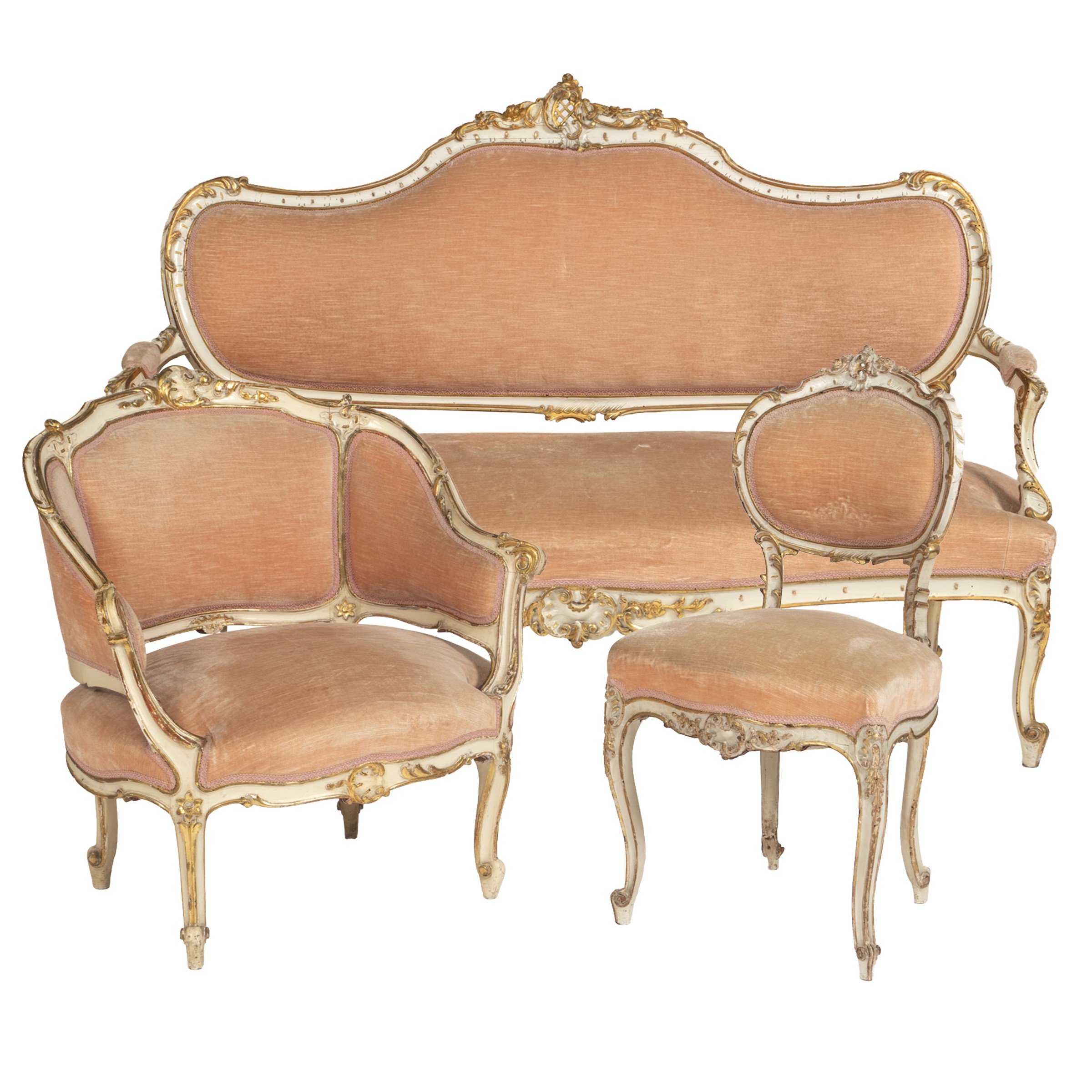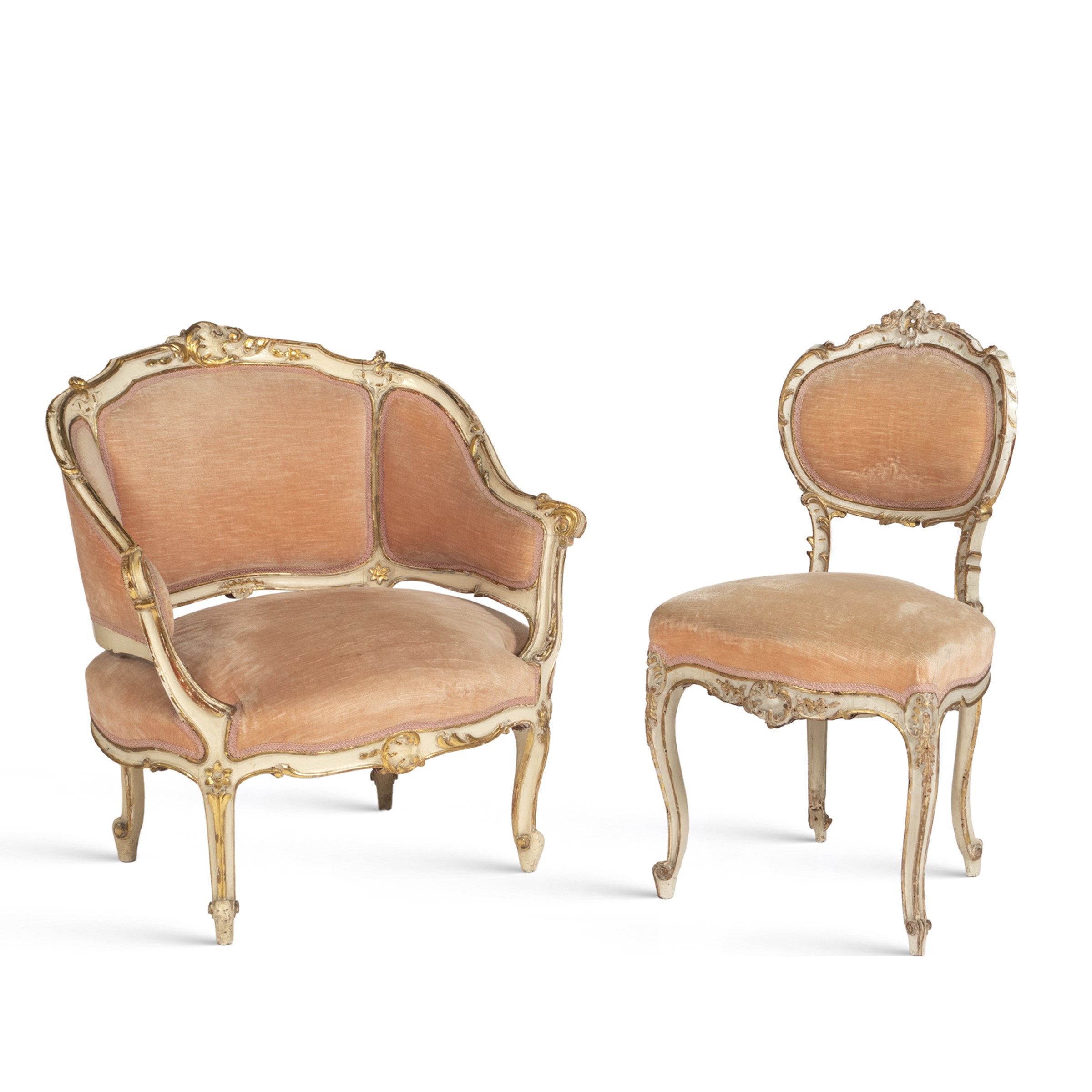 Italia, XIX Sec. composto da un divano, quattro poltrone e sei sedie, sedute e schienali rivestiti in tessuto rosa, usure