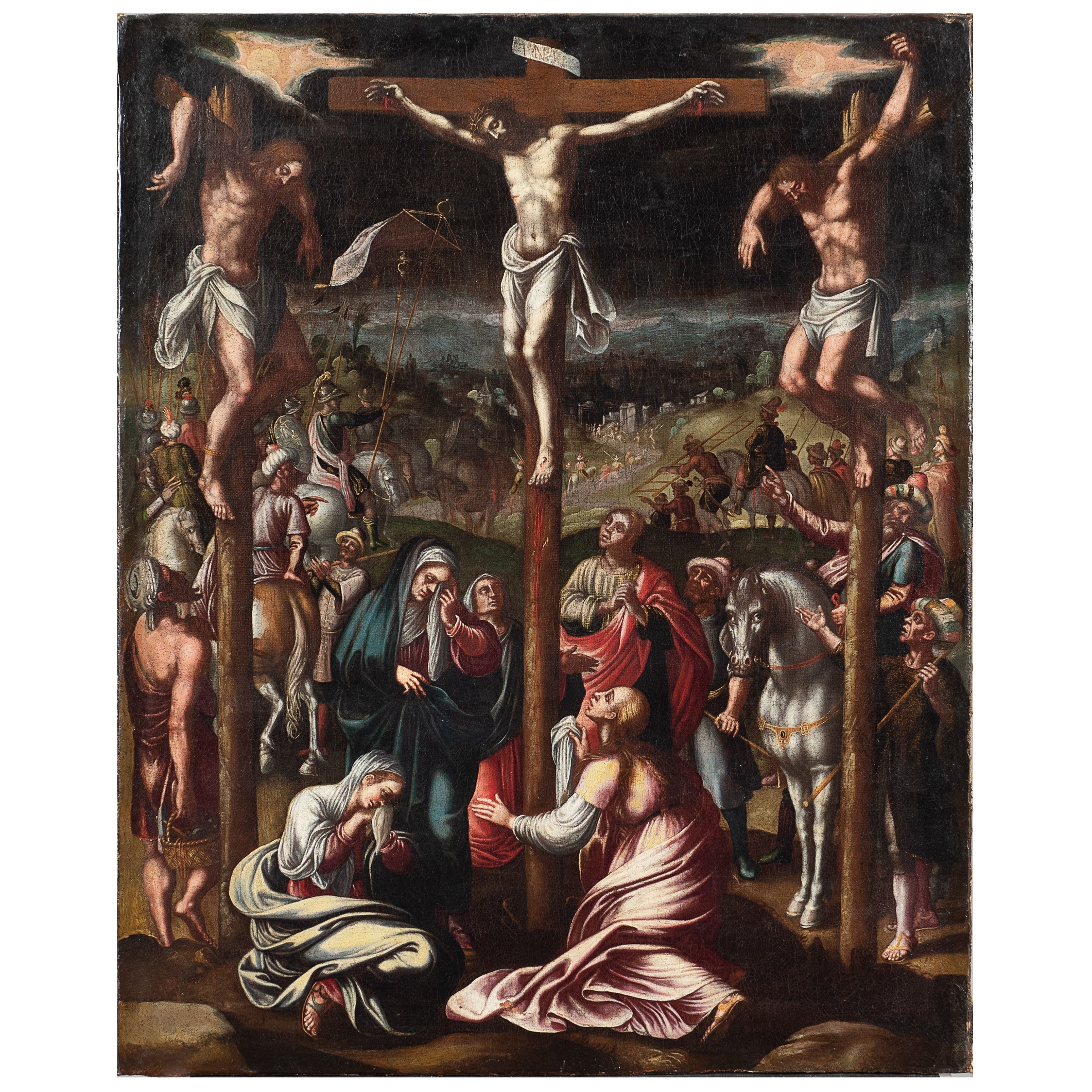 XVII Sec. Crocifissione, olio su tela, entro cornice in legno dorato