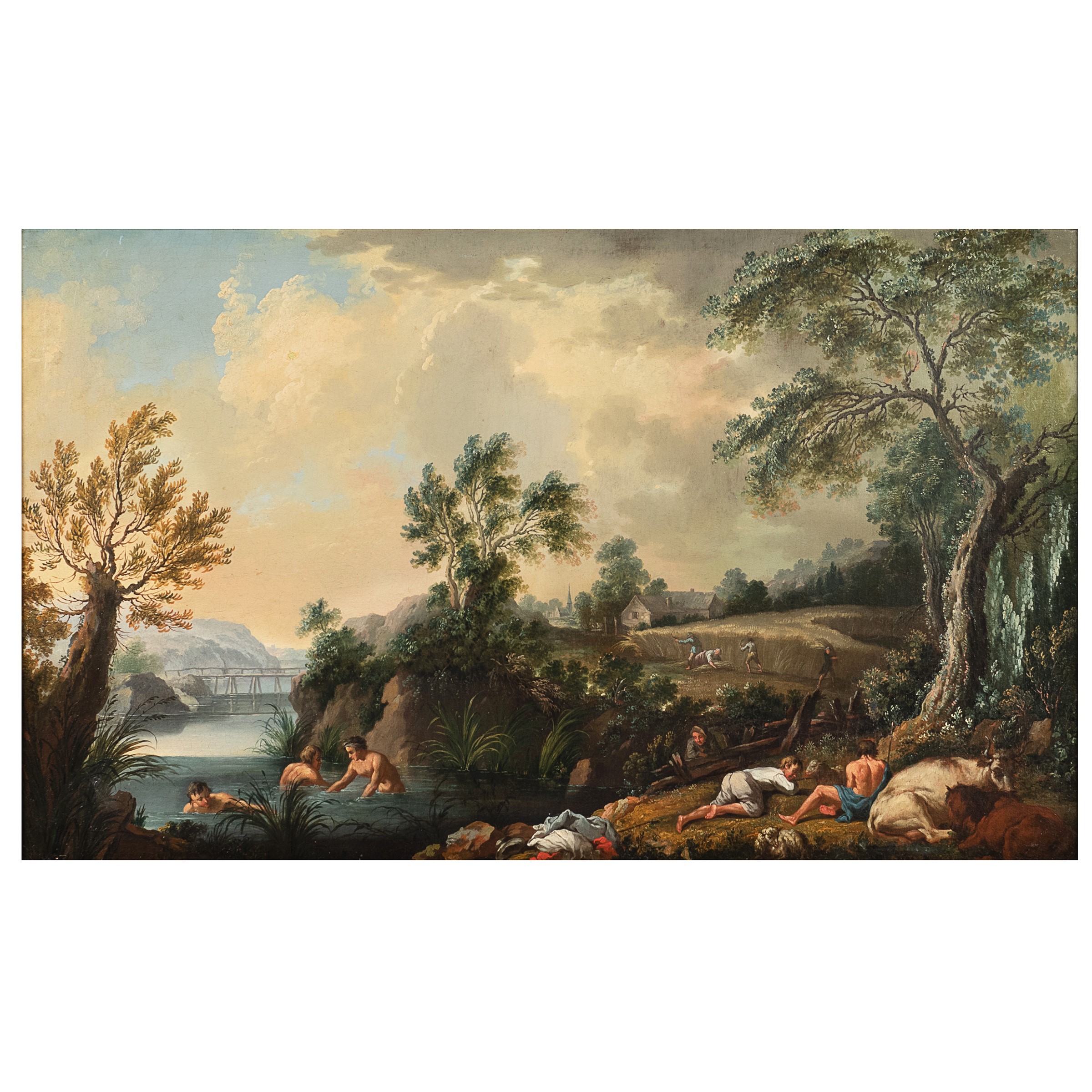XVII - XVIII Sec. Scena bucolica, olio su tela entro cornice in legno dorato