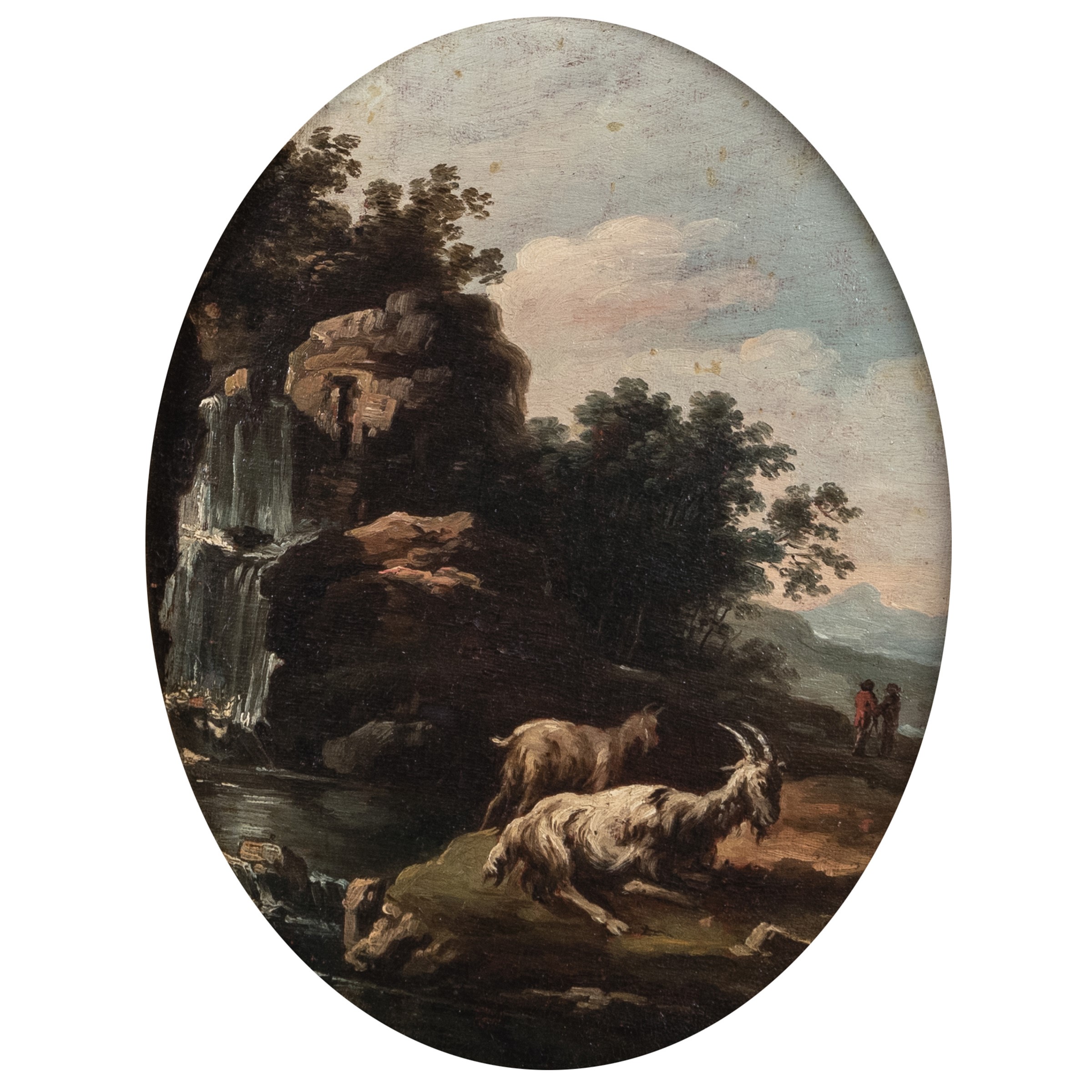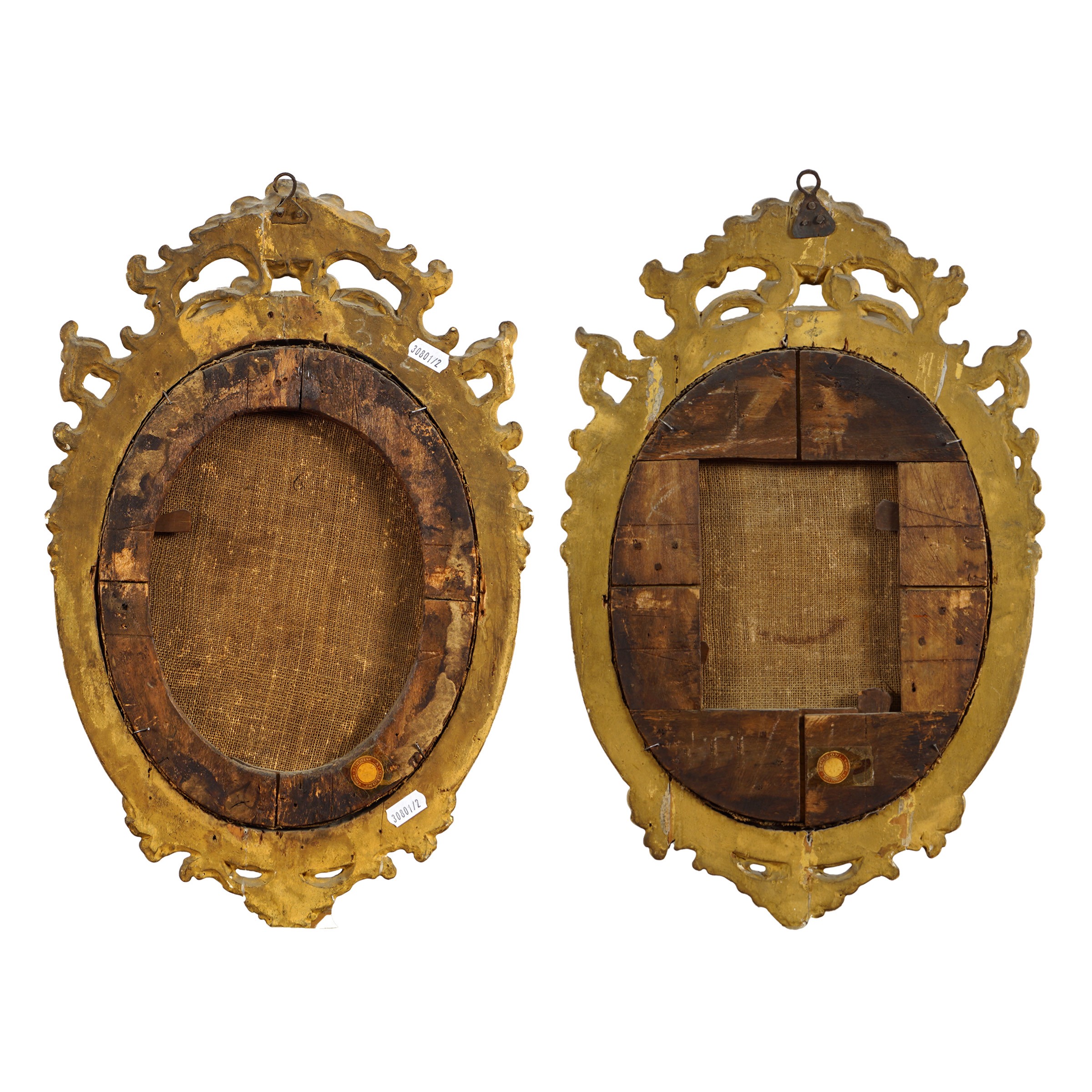 XVIII Sec. Campagna romana, coppia di oli su tela, entro cornici in legno dorato ed intagliato