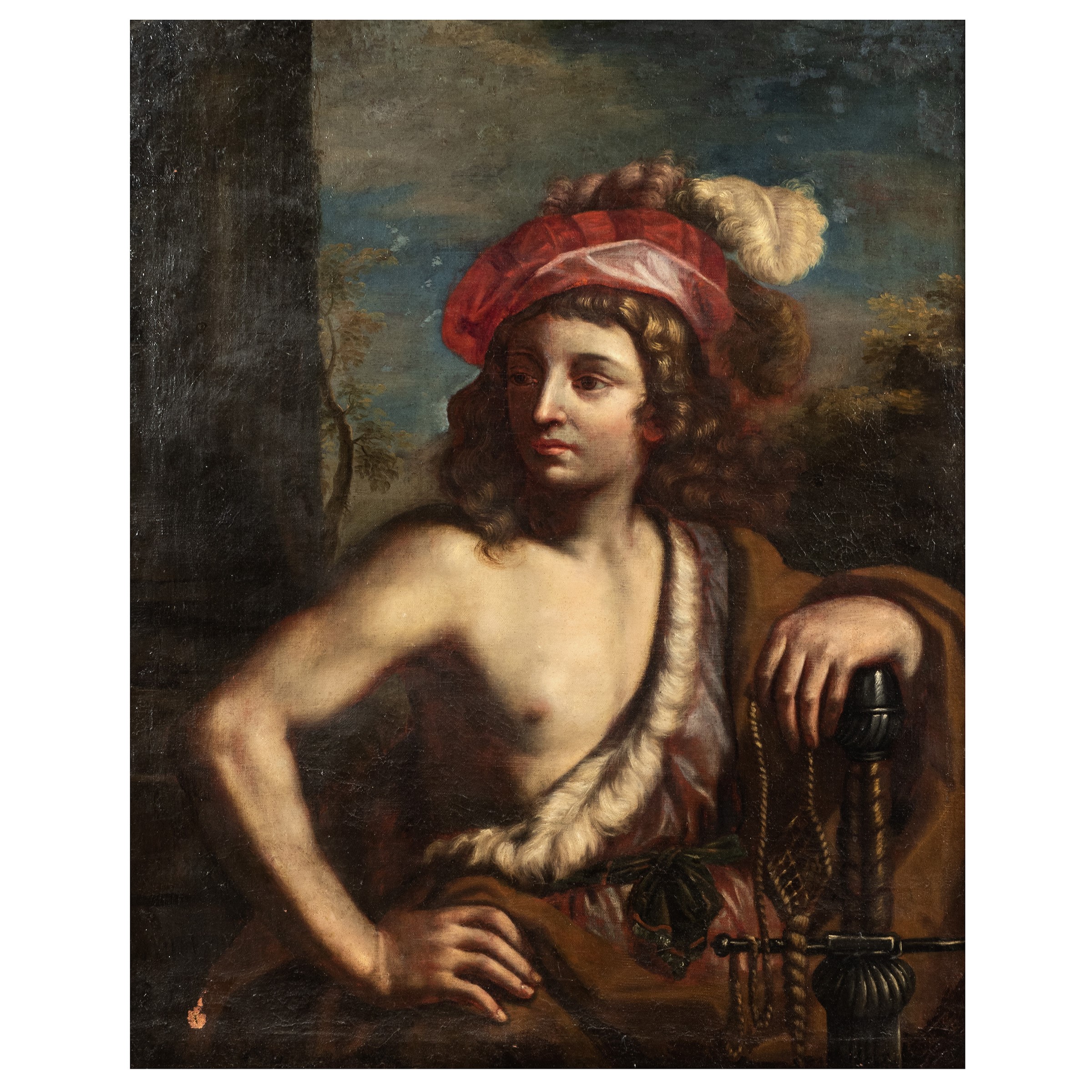 XVII Sec. Ritratto di giovane con spada e copricapo rosso, olio su tela, entro cornice