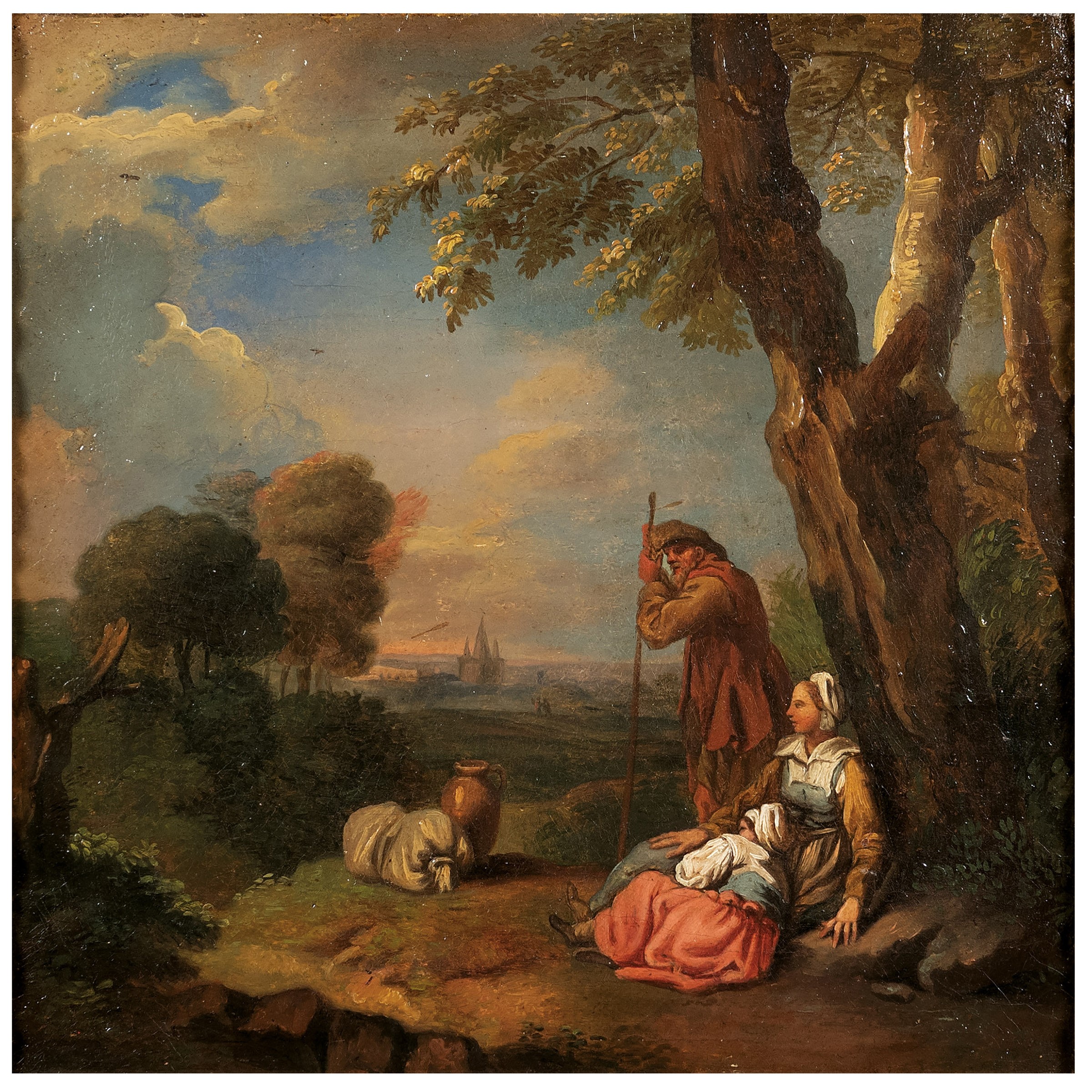 XVIII Sec. Scena campestre, olio su tela, entro cornice in legno dorato
