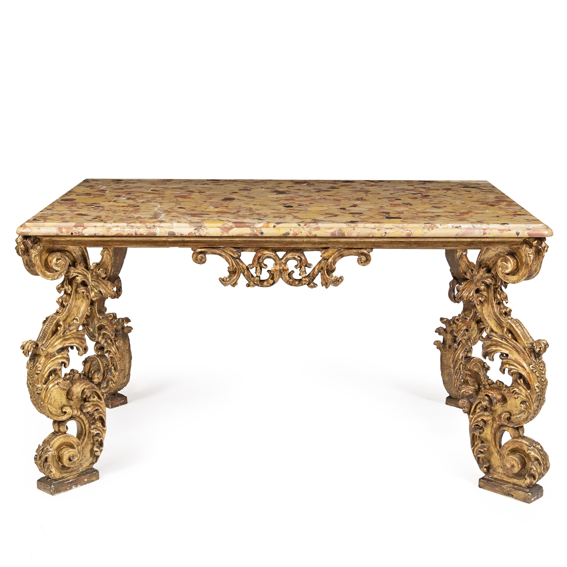 XVIII-XIX Sec. piano rettangolare in marmo breccia d'Aleppo, fascia sottostante poggiante su sostegni riccamente intagliati con motivi vegetali, usure alla dorature