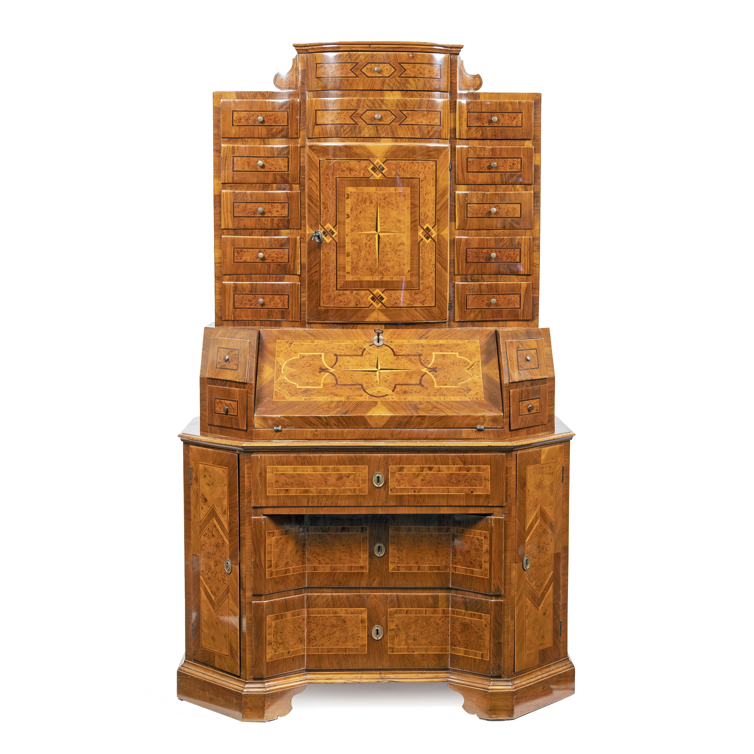 197x120x60 cm. Nord Europa, fine XVIII inizio XX Sec. intarsiato e filettato in legno di noce, radica ed ebano, struttura architettonica bombata sul fronte, parte superiore con tiretti vari ed uno sportello, anta calatoia con all'interno sei tiretti e uno scomparto a vista, parte inferiore a tre cassetti e due ante laterali, piedi a mensola, lievi usure