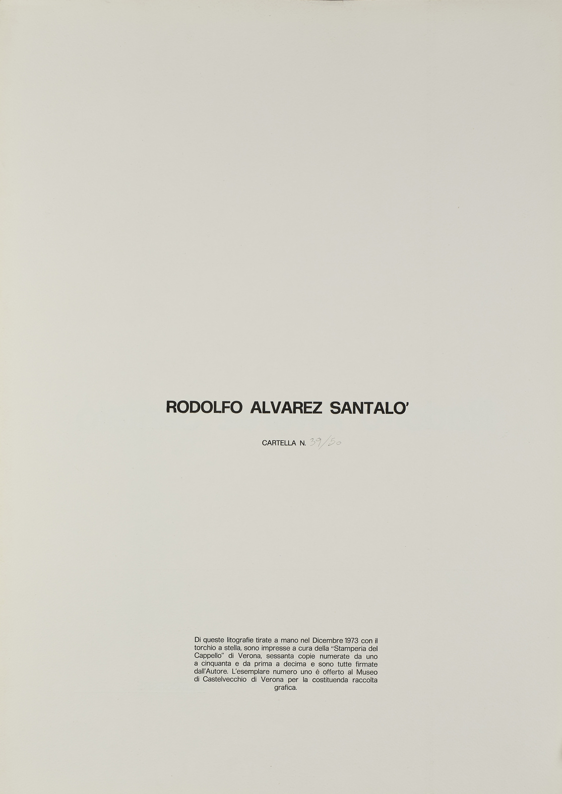39/50. Tiratura, firma e anno in basso a matita. Timbro a secco Comune di Verona Musei d'arte. Edizione totale: 60 numerate da 1 a 50 + I a X. Edizioni del Cappello, Verona.