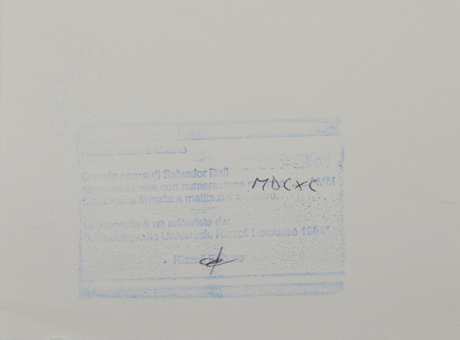 MDCXC/MM. Tiratura e firma in basso a matita. Timbro a secco Daĺ in basso a sinistra. Rizzoli Editore, Milano. Edizione totale: 2000 esemplari. Carta Bfk Rivers infinity.