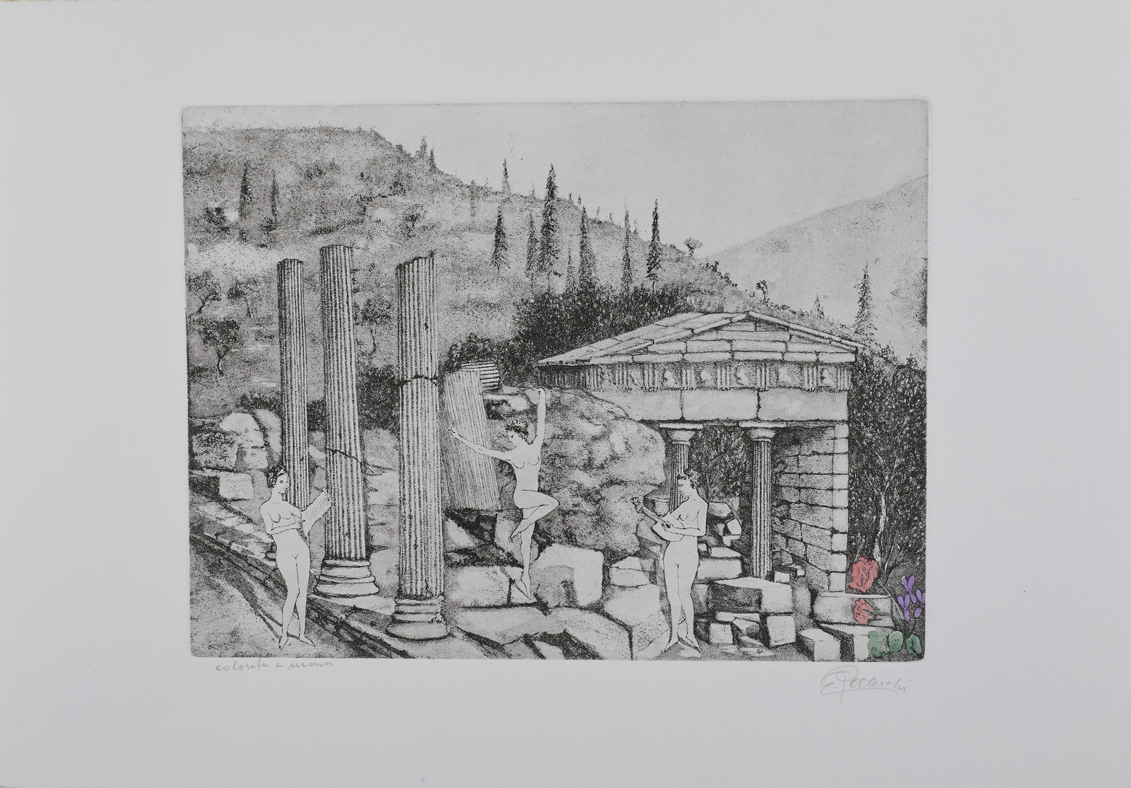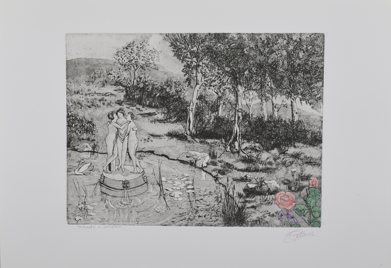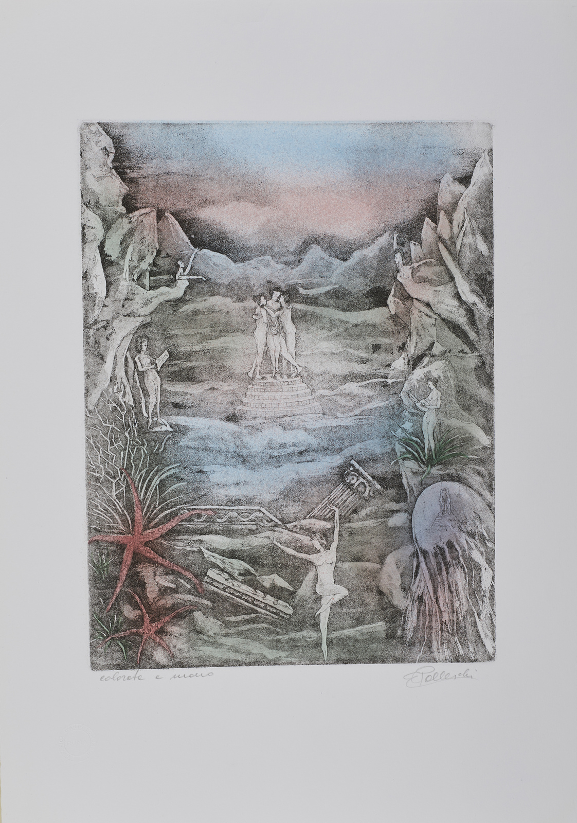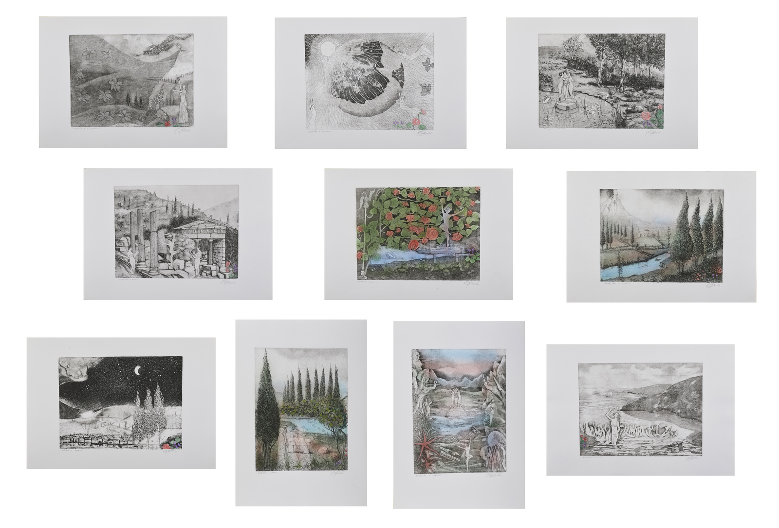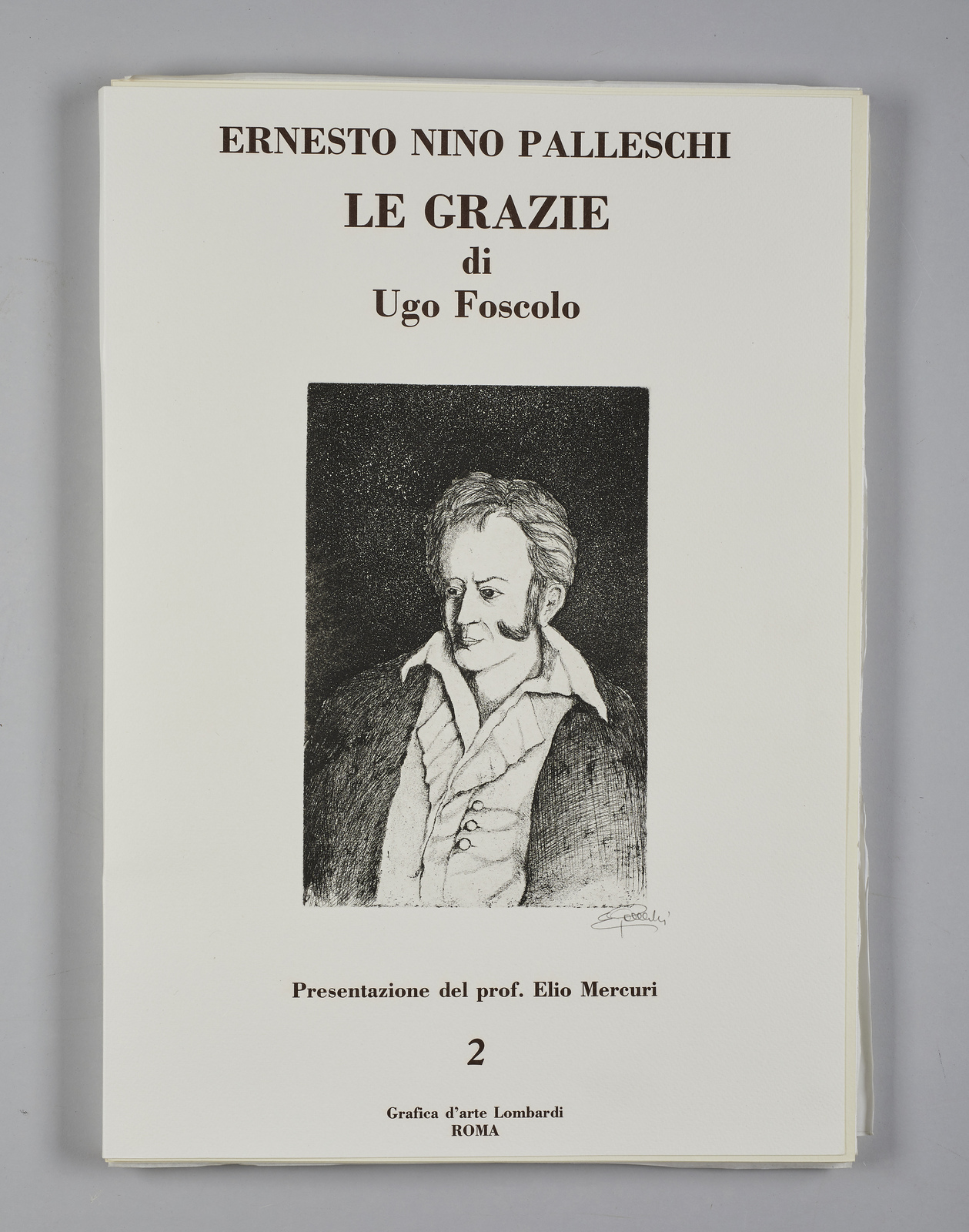 Cartella composta da n. 10 incisioni all'acquaforte, acquatinta e ceramolle ispirate ai tre inni del poema Le grazie di Ugo Foscolo firmate in basso a matita. Dimensioni lastre: 24x32 cm. Edizione totale: 125 esemplari, tutti colorati a mano e firmati dall'artista in copie uniche non numerate. Grafica d'arte Lombardi, Roma.