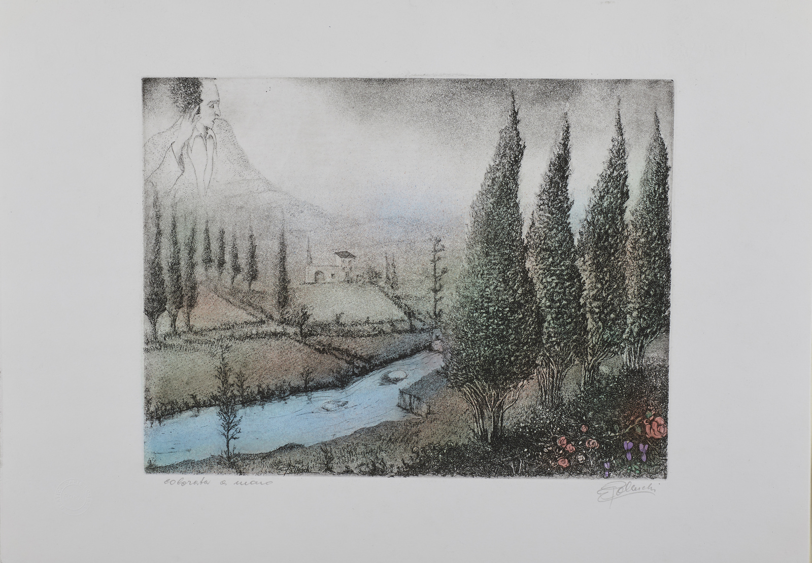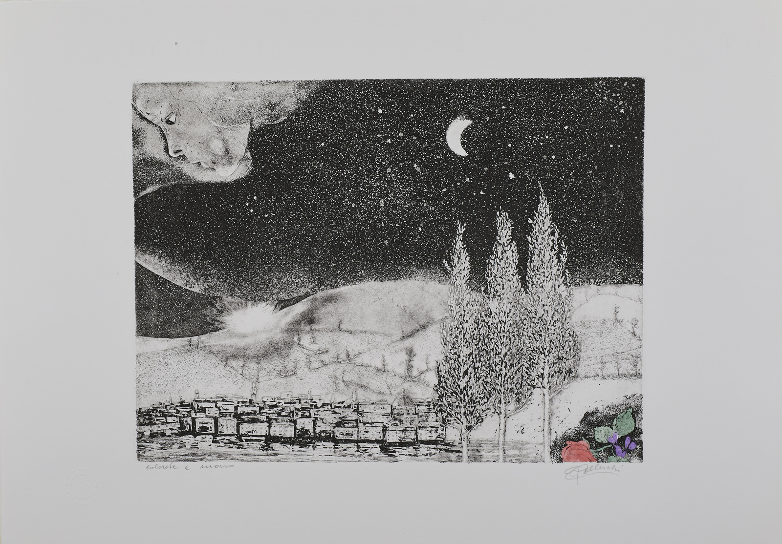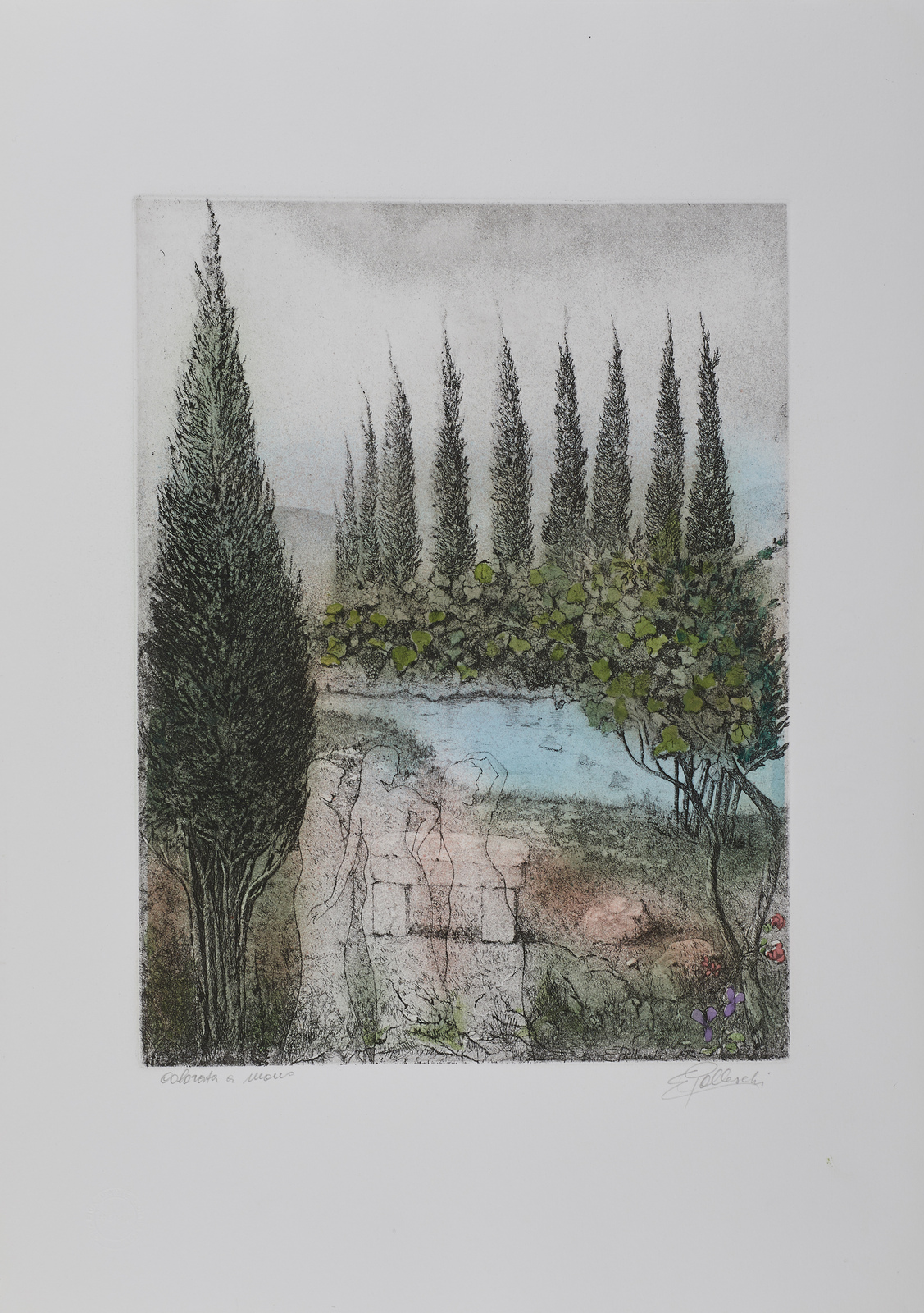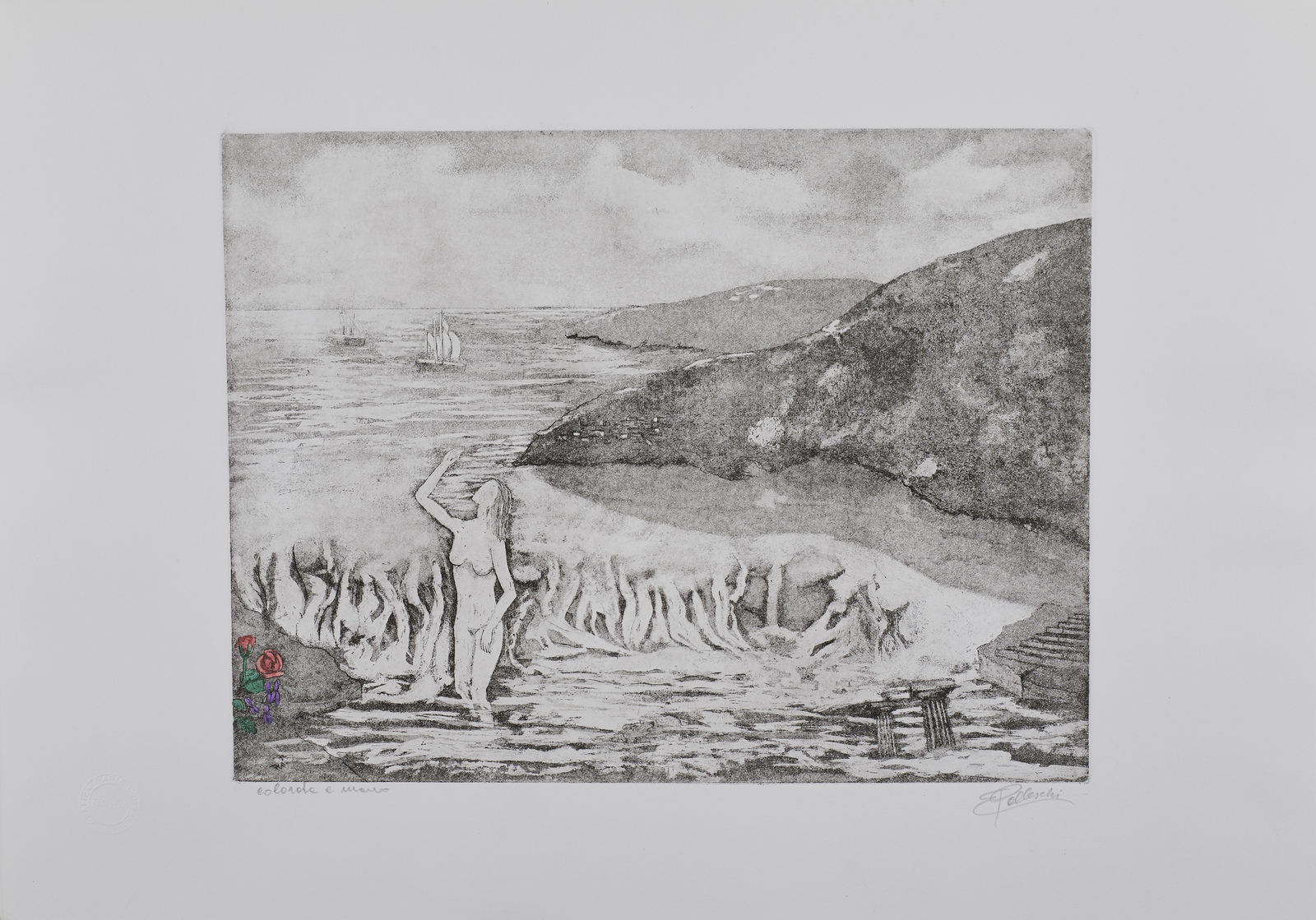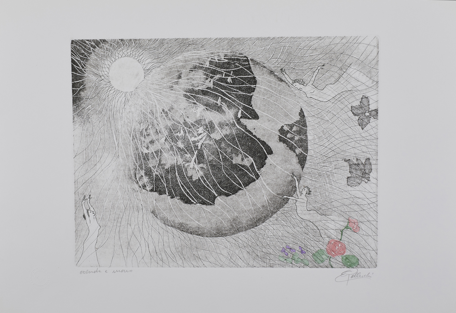 Cartella composta da n. 10 incisioni all'acquaforte, acquatinta e ceramolle ispirate ai tre inni del poema Le grazie di Ugo Foscolo firmate in basso a matita. Dimensioni lastre: 24x32 cm. Edizione totale: 125 esemplari, tutti colorati a mano e firmati dall'artista in copie uniche non numerate. Grafica d'arte Lombardi, Roma.