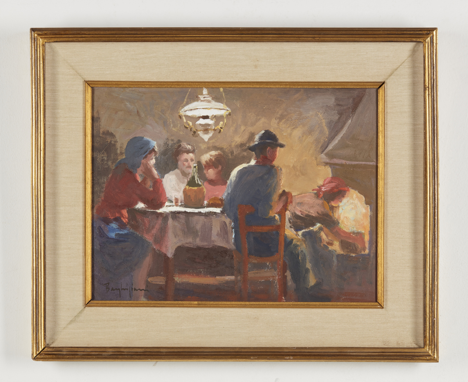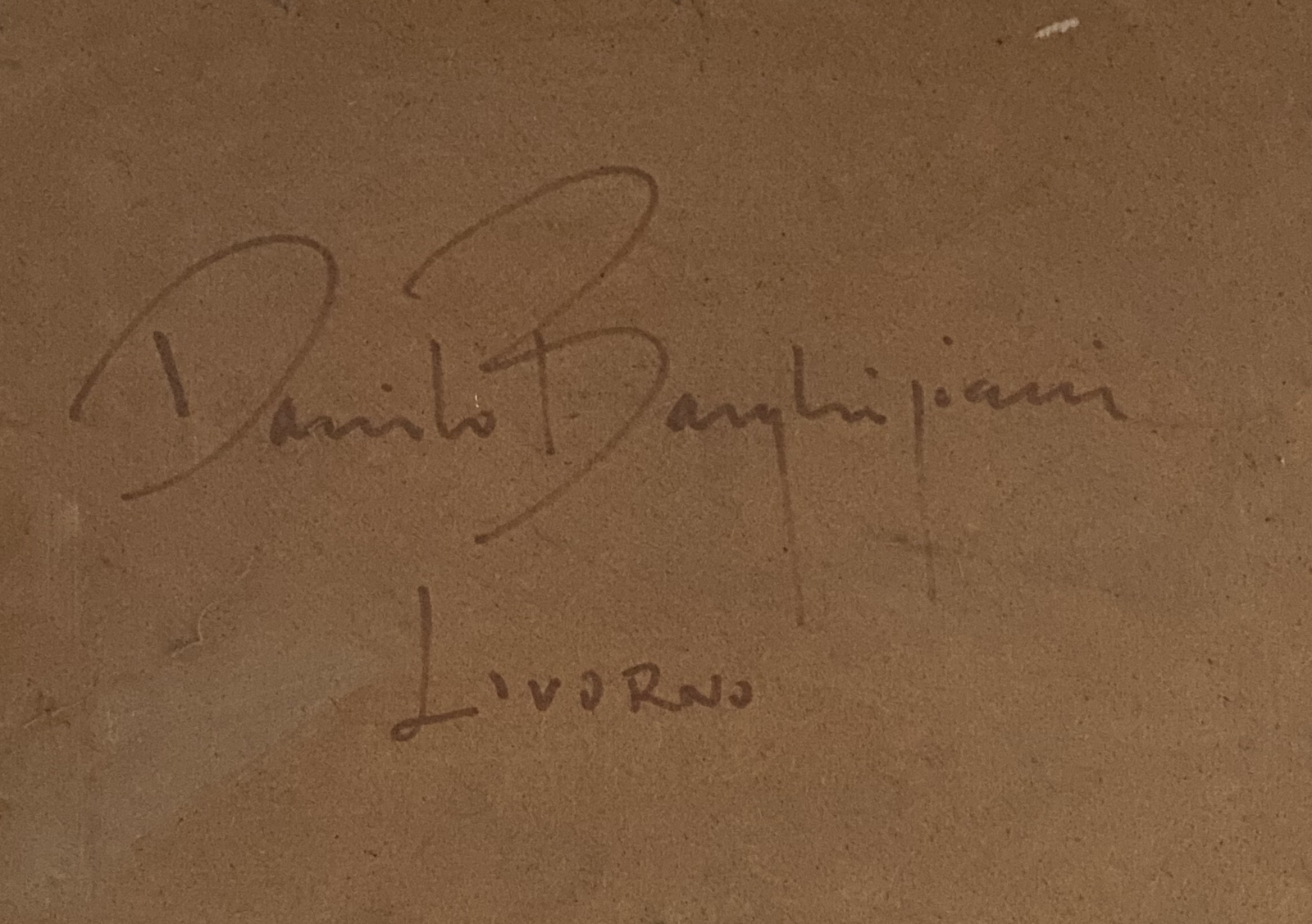 Firma in basso a sinistra. Titolo e ulteriore firma sul retro. Difetti.