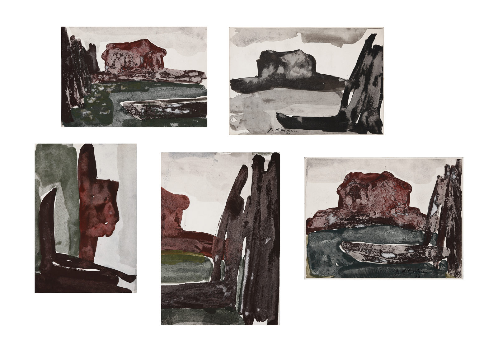 Dimensioni: 30x21 cm. 31x23 cm, 32x22 cm, 24x18.5 cm, 42.5x29.5 cm. Due opere presentano firma e anno in basso a destra (1963).