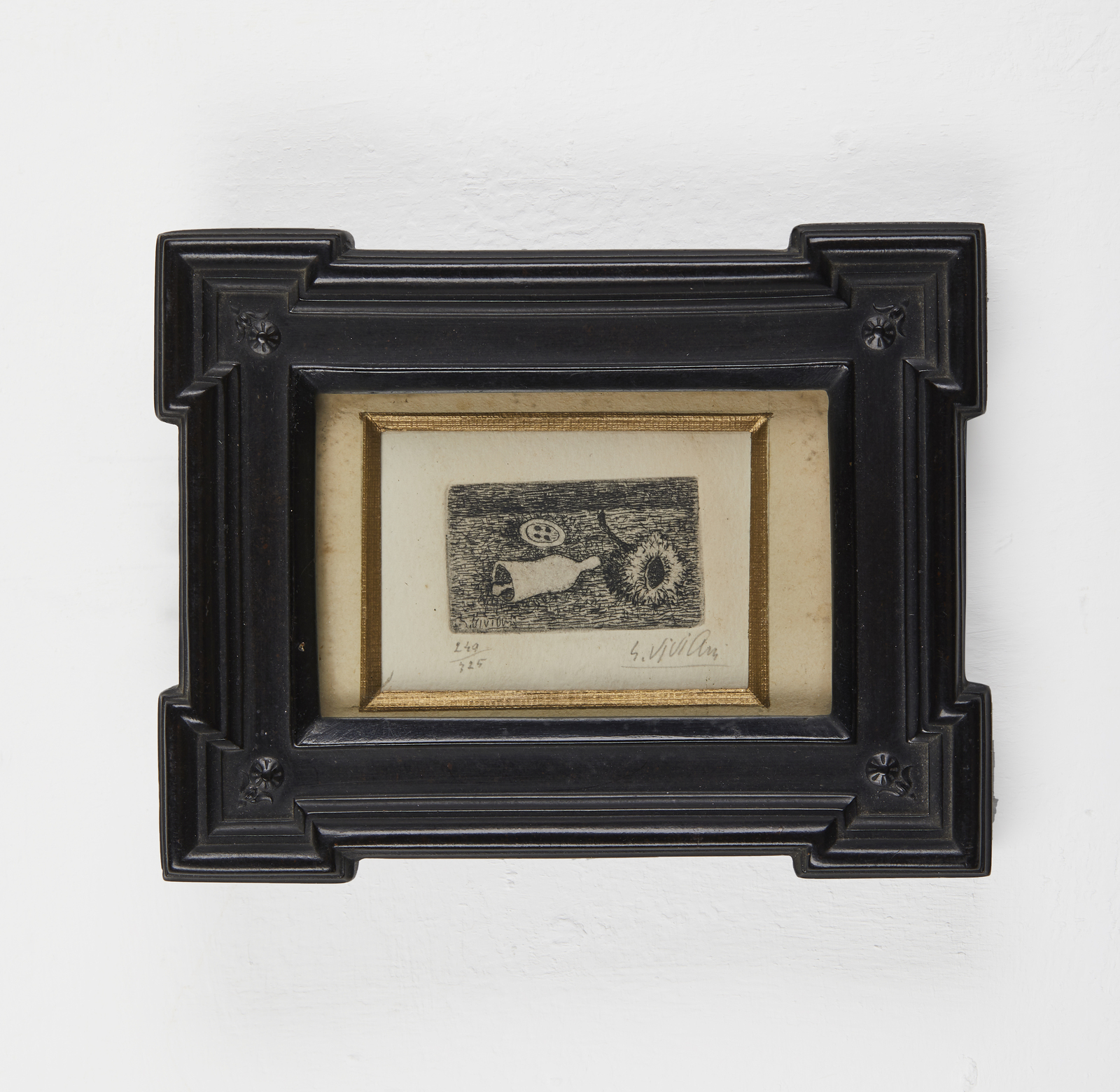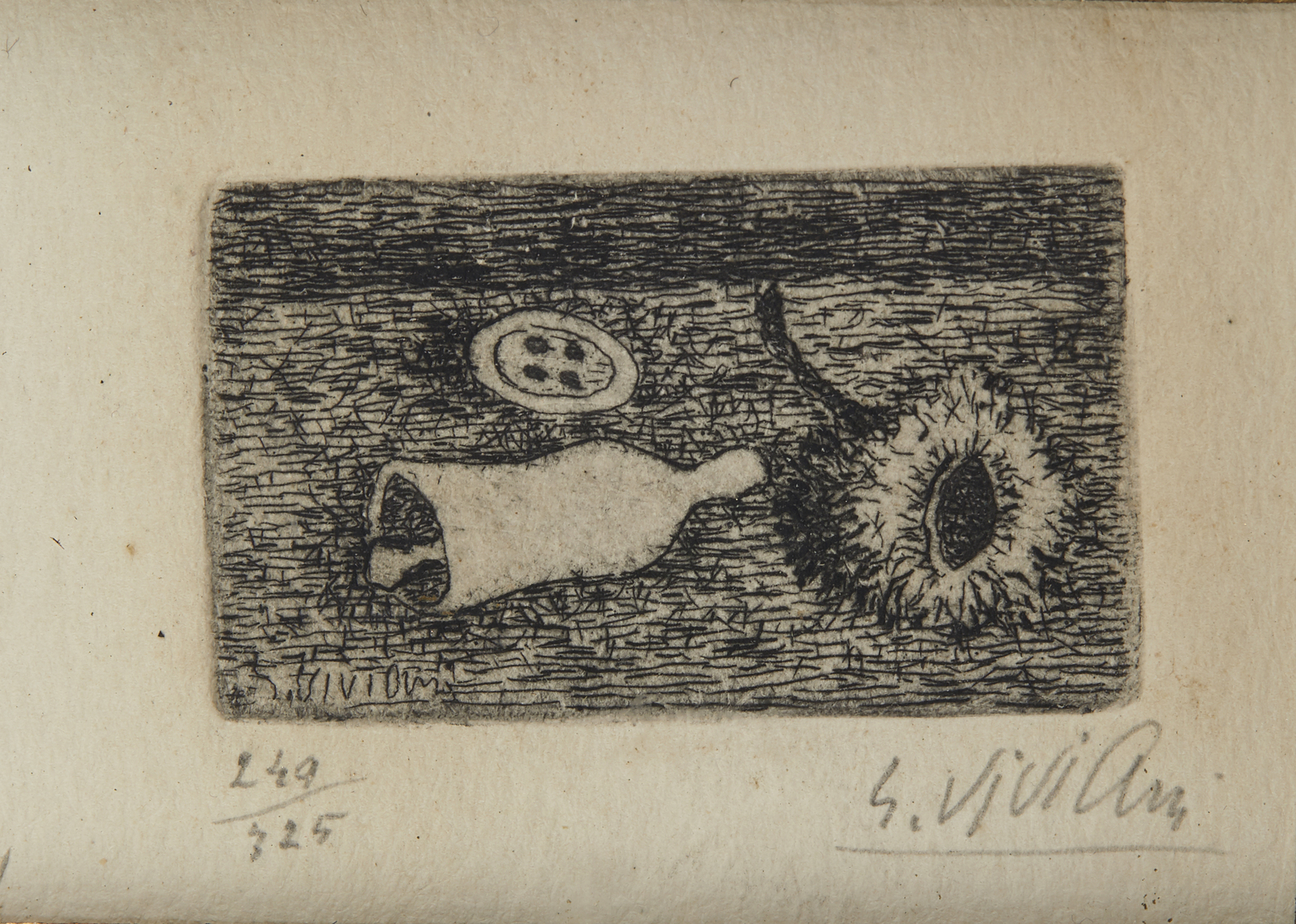 249/325. Tiratura e firma in basso a matita. Edizione totale: 325 esemplari. Dimensione lastra: 2.5x4 cm.