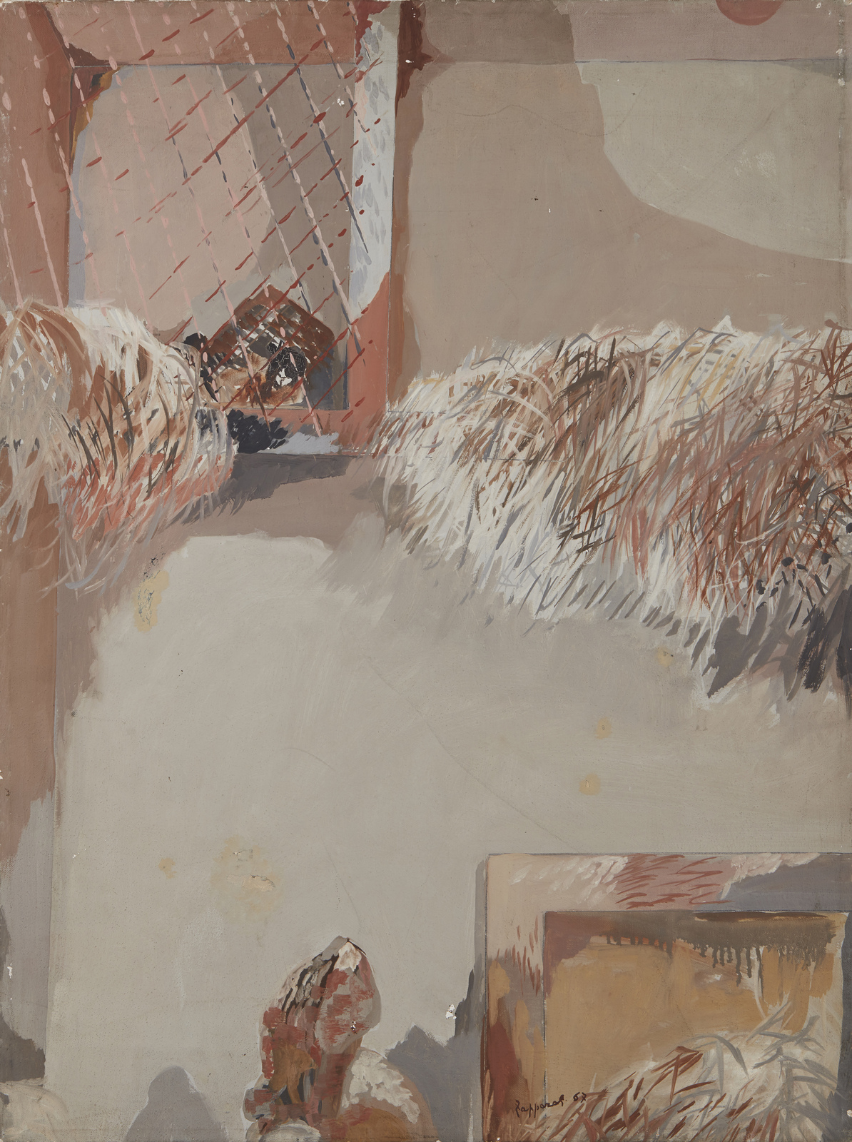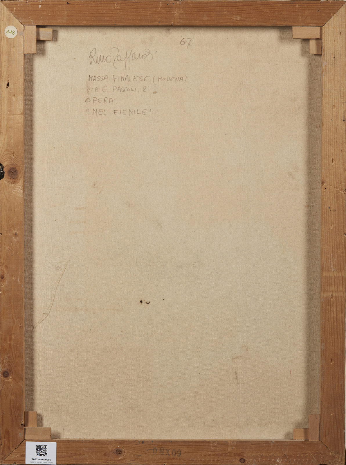 Firma e anno in basso a destra. Titolo, firma e anno al retro. Difetti.