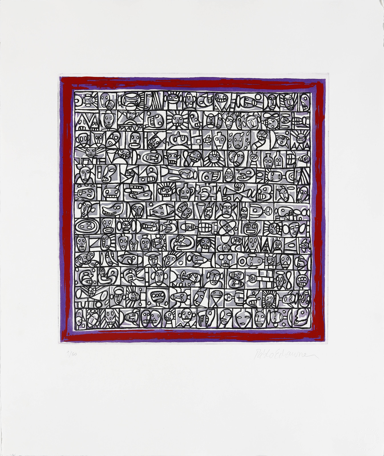 1/60. Tiratura e firma in basso a matita. Edizione totale: 60 +VII. Dimensione lastra: 35.5x35.5 cm. Timbro a secco Stamperia Berardinelli, Verona, in basso a destra.