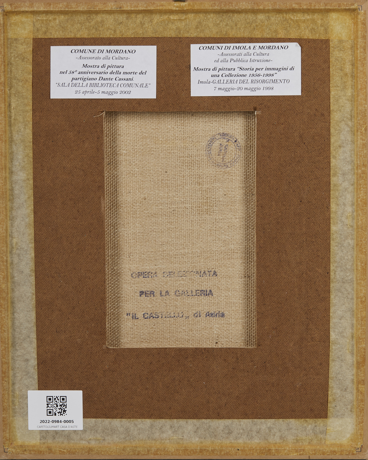 Firma in basso a sinistra. Al retro timbro Galleria Il Castello, Adria. Autentica dell'artista su fotografia (dimensioni errate).