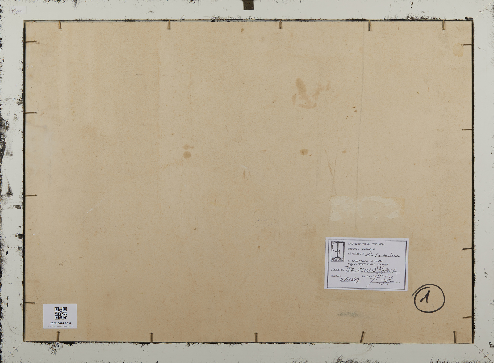 Firma in basso a destra. Al retro cartiglio Mea Ars.