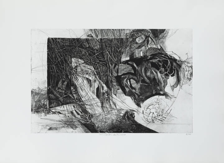 50x70 foglio 31 5x49 acquaforte e acquatinta tirata a braccia da Giacomo Figus nel suo laboratorio di stampatore in Torino es. 2/100 Opera firmata in basso al centro e numerata in basso a destra (a matita sul foglio) Timbro a secco dell'artista sul foglio Opera realizzata in esclusiva per la TRAU S.p.A. di Torino