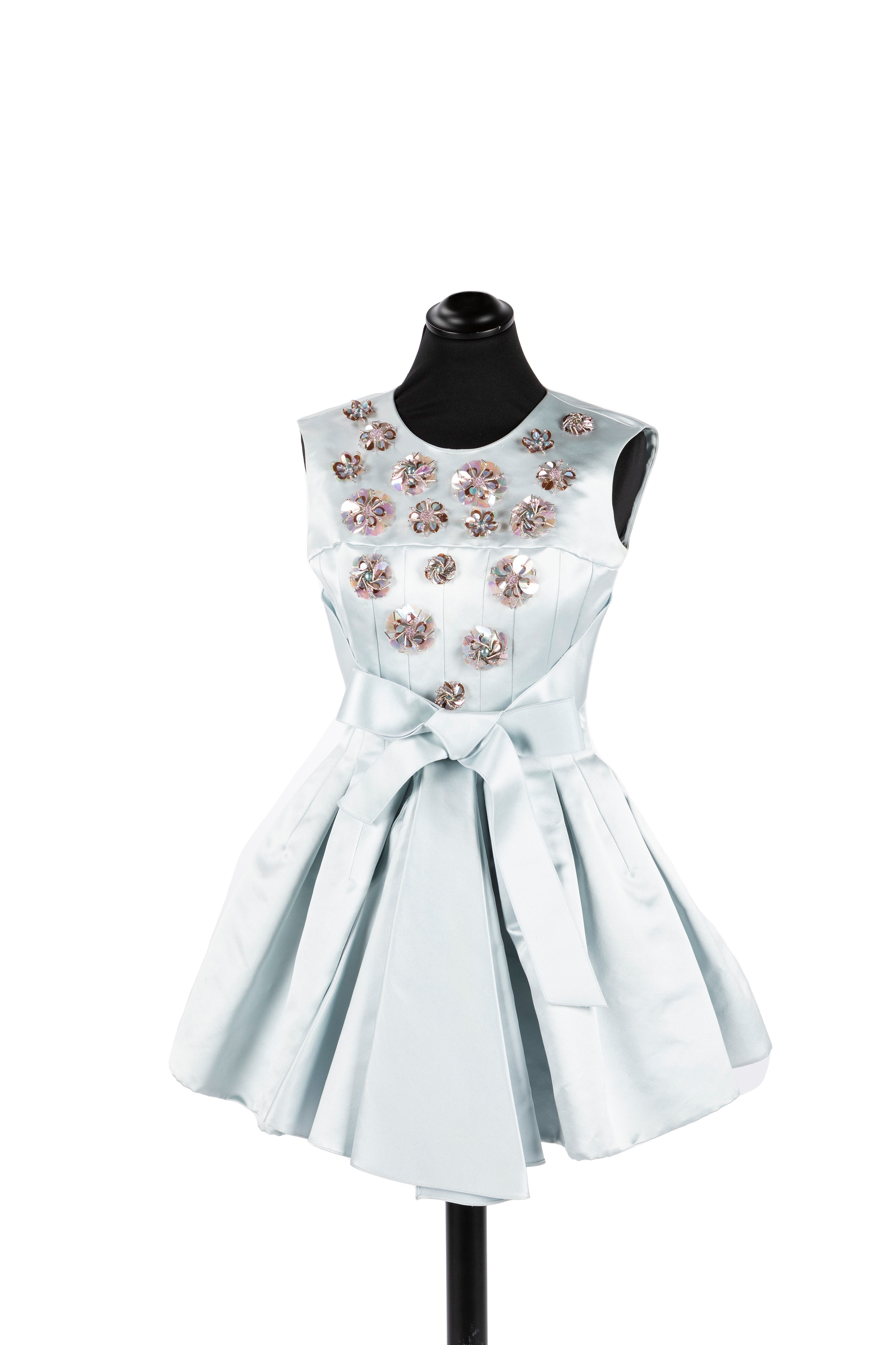 in raso di seta color azzurro chiaro, smanicato, applicazioni a fiore in paillettes, tg. 34 francese (38 italiano), (lievi difetti)