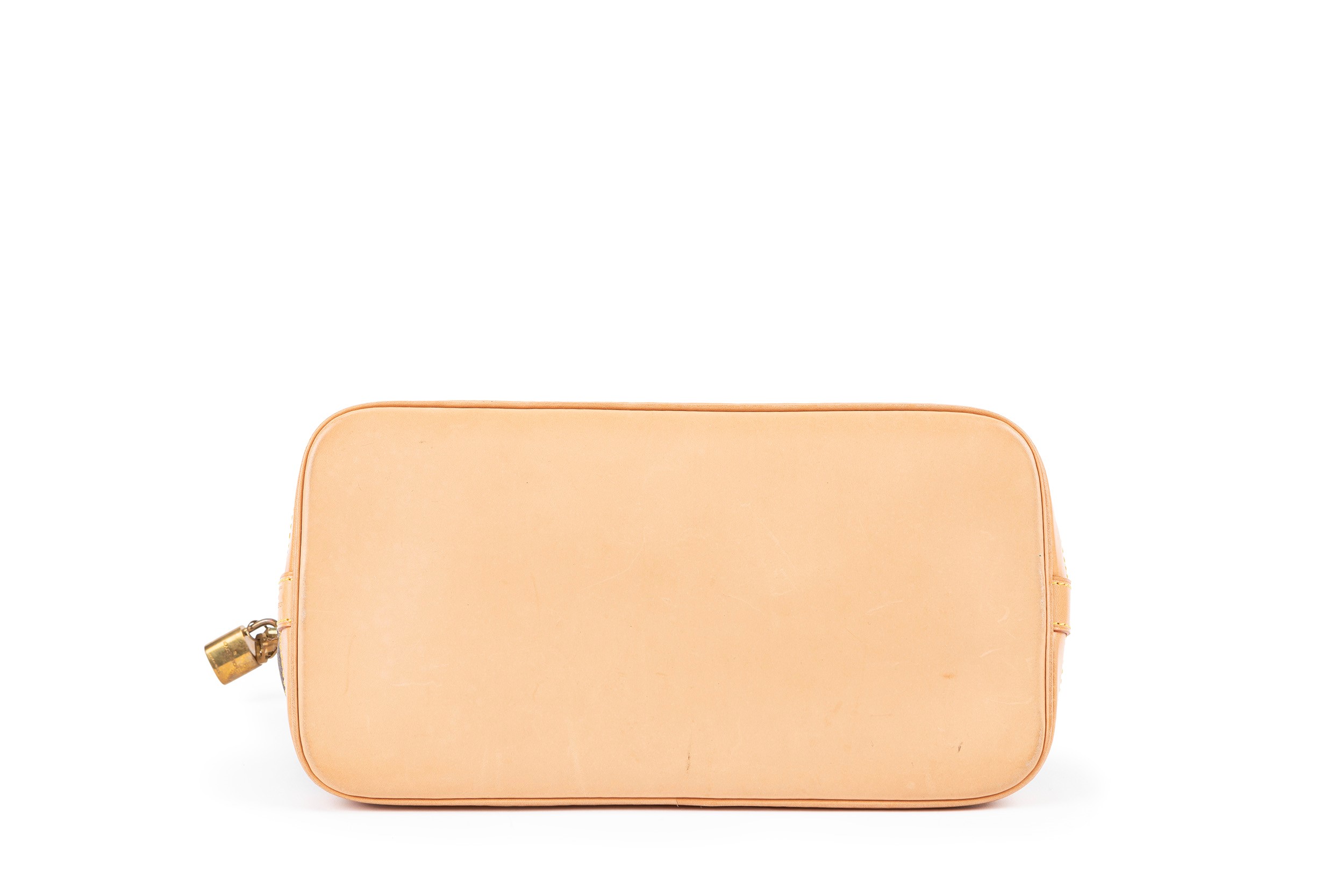 in tela monogram, chiusura a cerniera con lucchetto e chiavi, doppi manici, cm 30 (difetti)