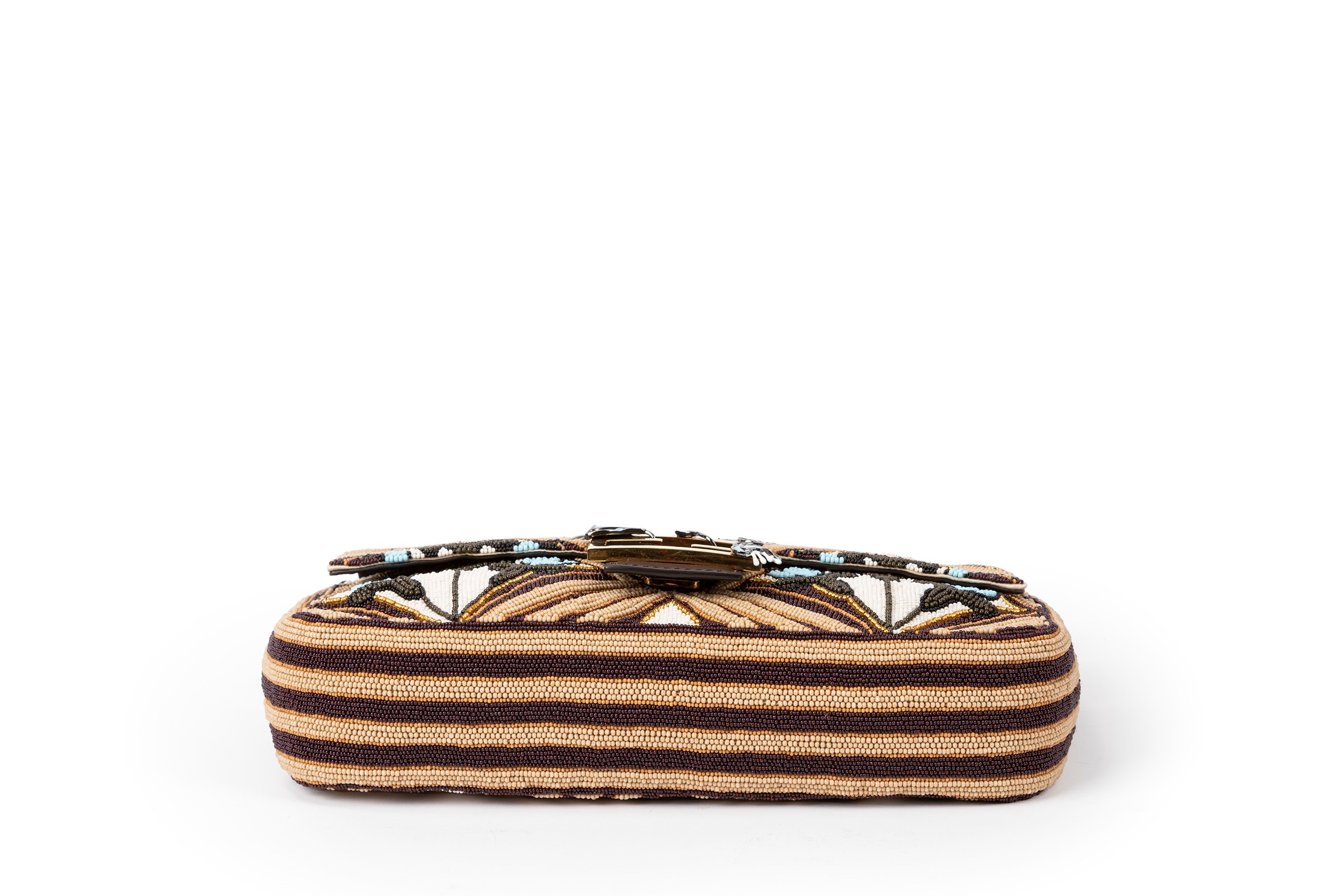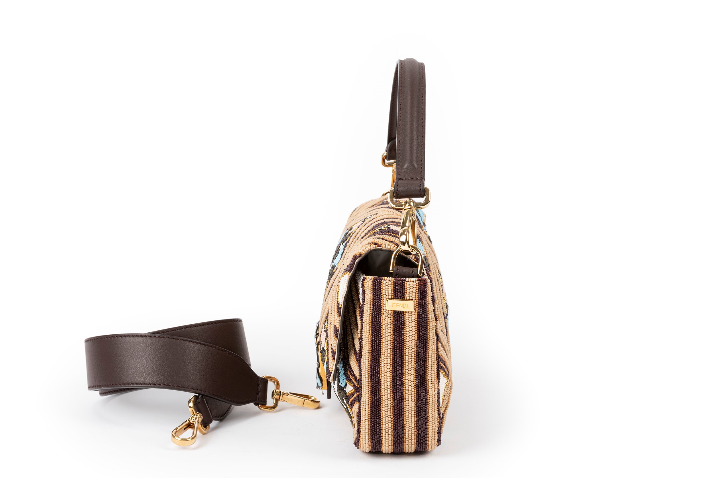 interamente ricamata con perline, decoro floreale nel toni del panna, marrone, beige, azzurro e rosa, dettagli in metallo dorato e smalti, doppia tracolla staccabile in pelle, cm 27, con sacchetto e scatola