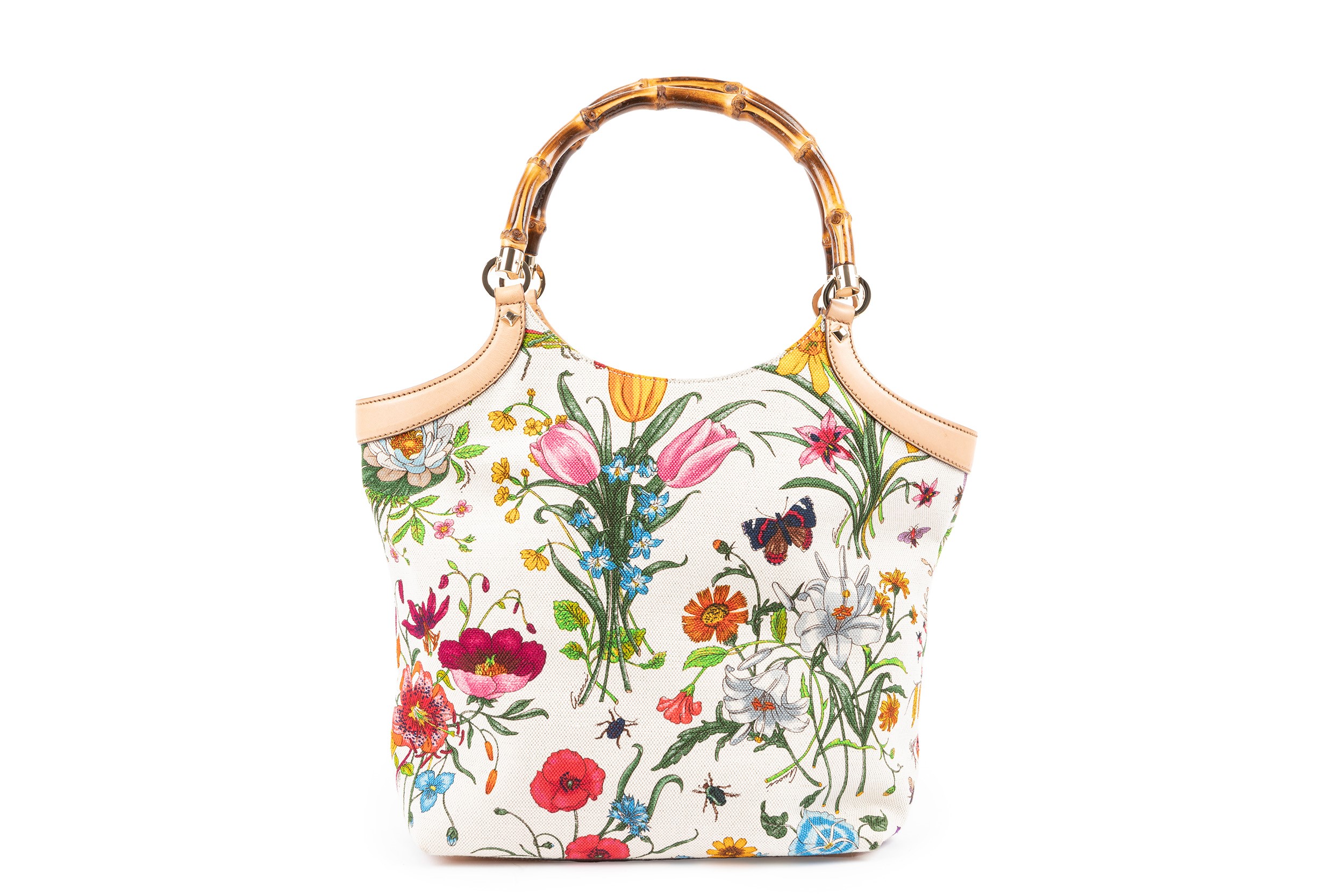 in tessuto stampato a fiori su fondo color ecru, doppi manici in bambù, dettagli in metallo dorato e profili in pelle, cm base 24 x 11, con sacchetto (lievi difetti)