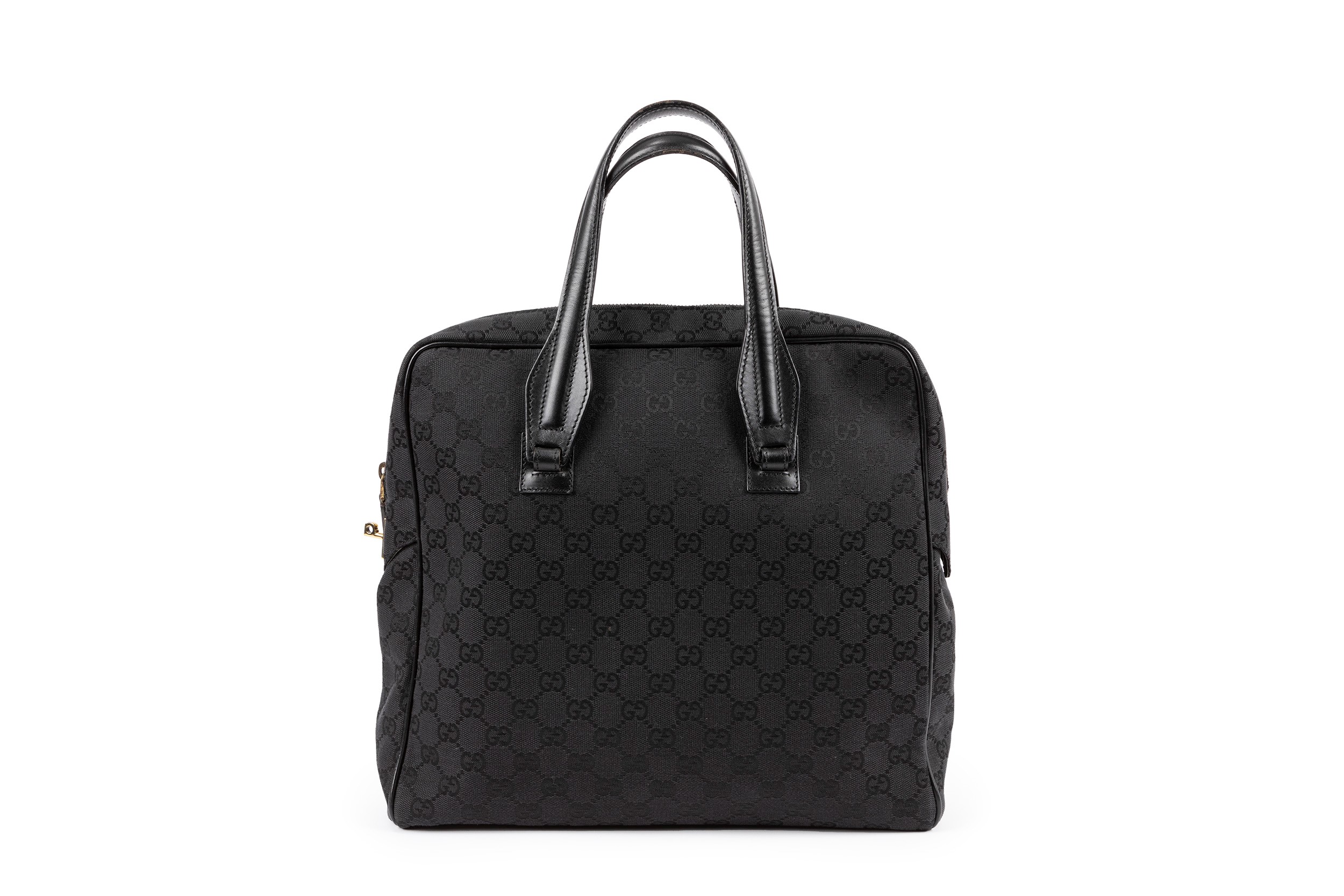 in tela logata color nero, doppi manici in pelle, chiusura a cerniera, cm 32, con sacchetto (lievi difetti)