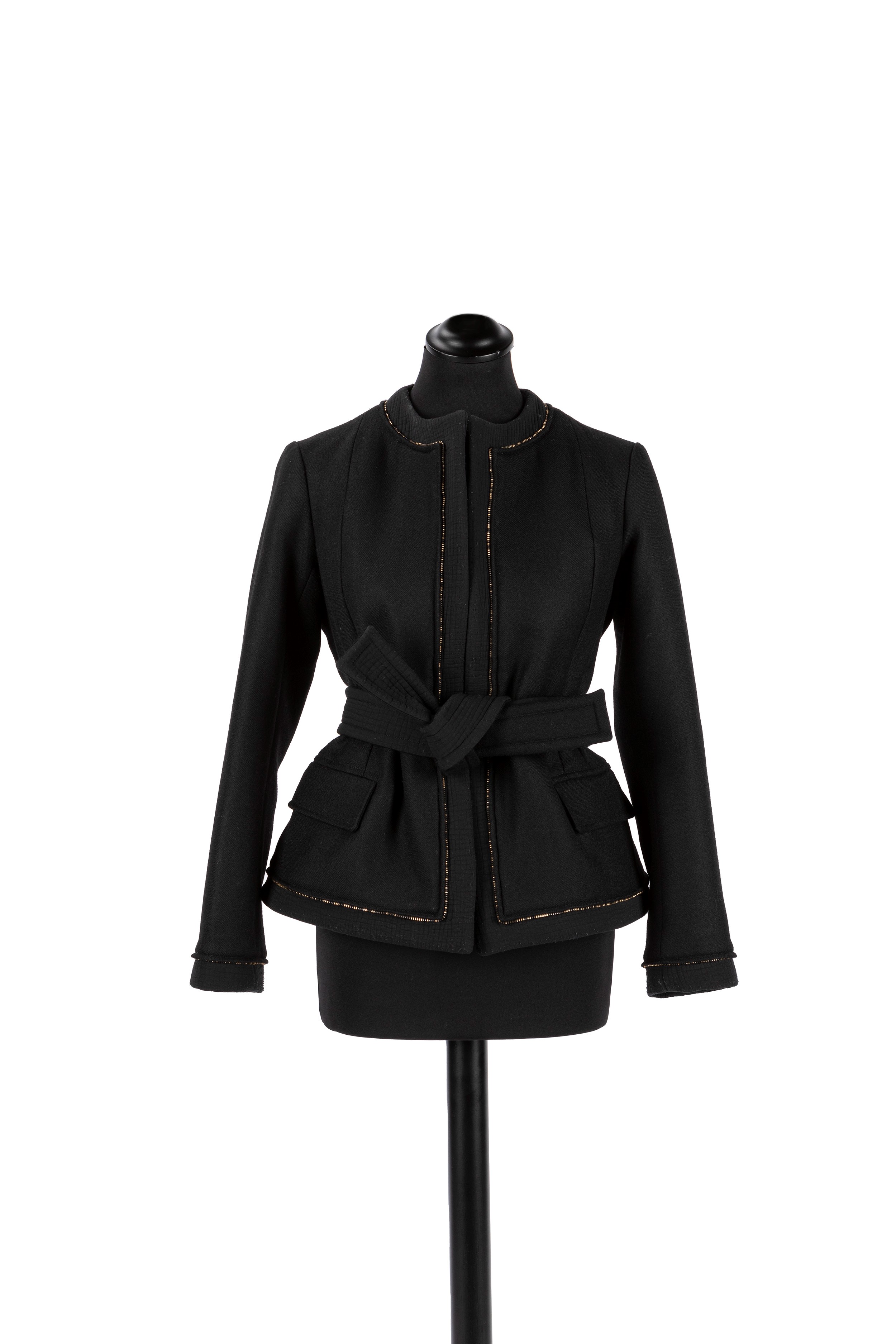 in lana color nero con profili dorati, tasche e cintura, taglia 36