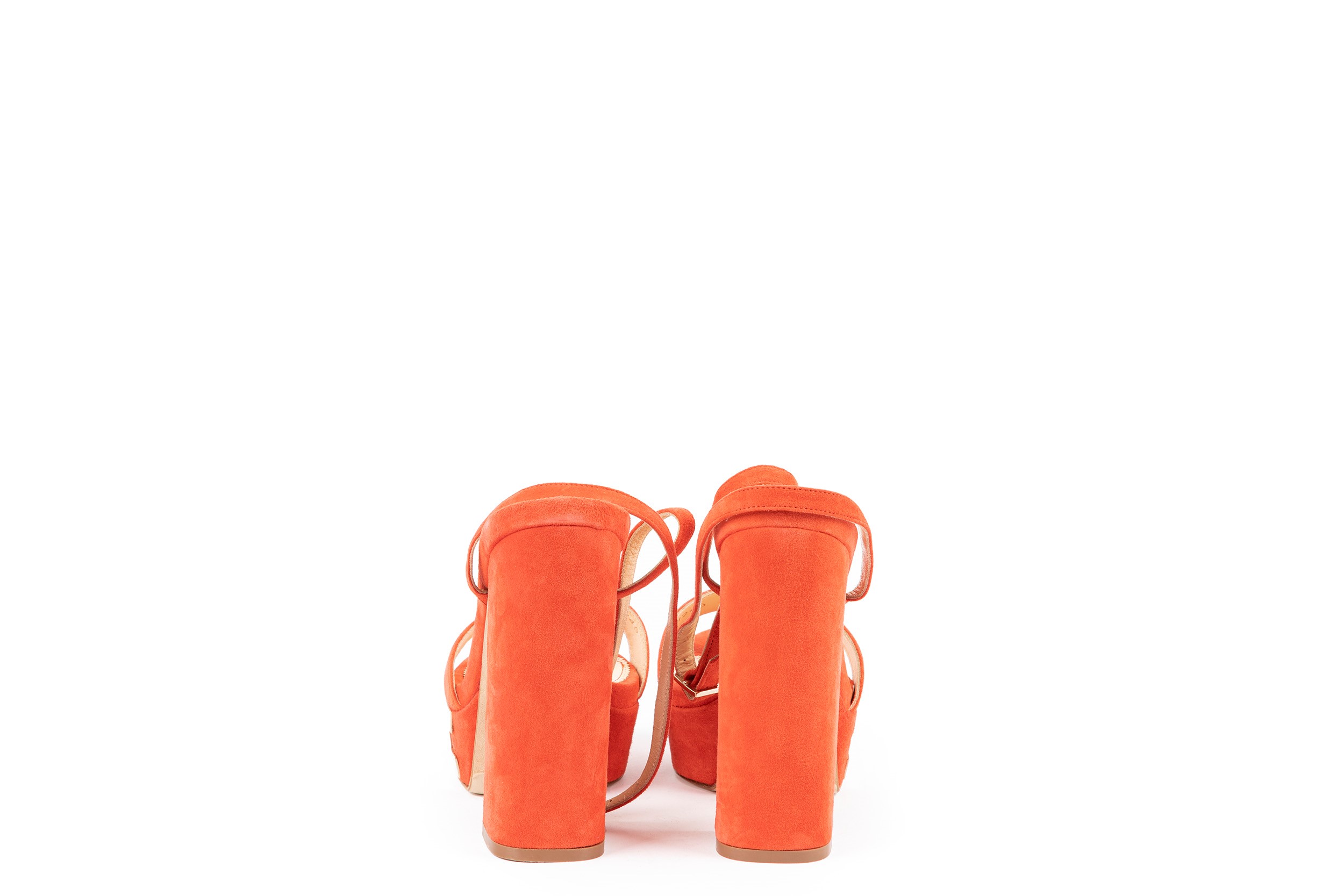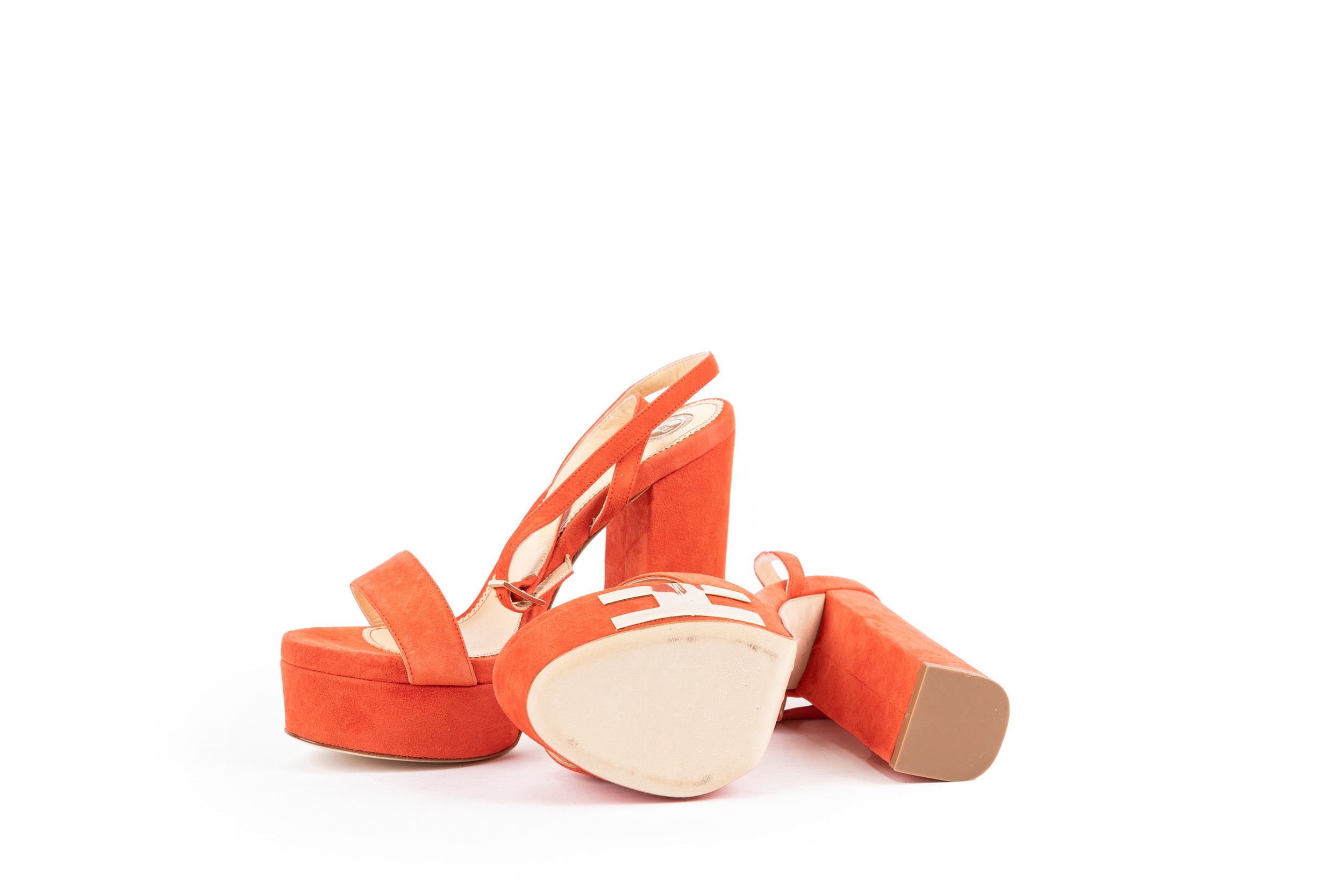 in camoscio color arancio, tacco cm 13, misura 39, con sacchetto e scatola (lievissimi difetti), (nuovi e mai usati)