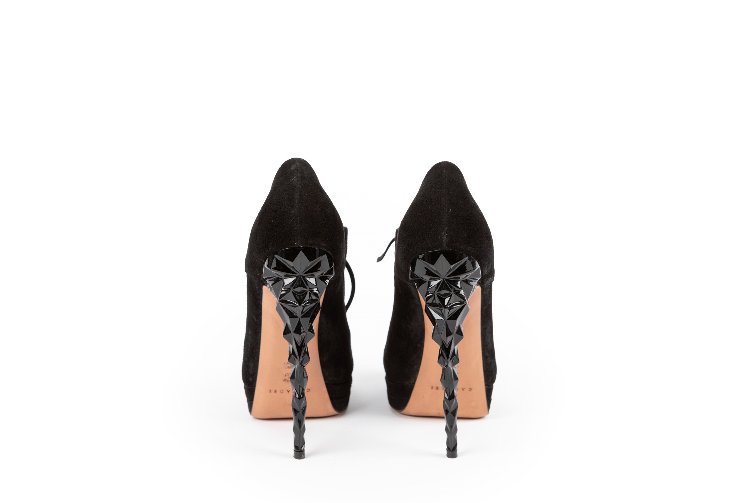in camoscio, color nero, con stringhe, tacco sfaccettato, cm 14, misura 38 (difetti)