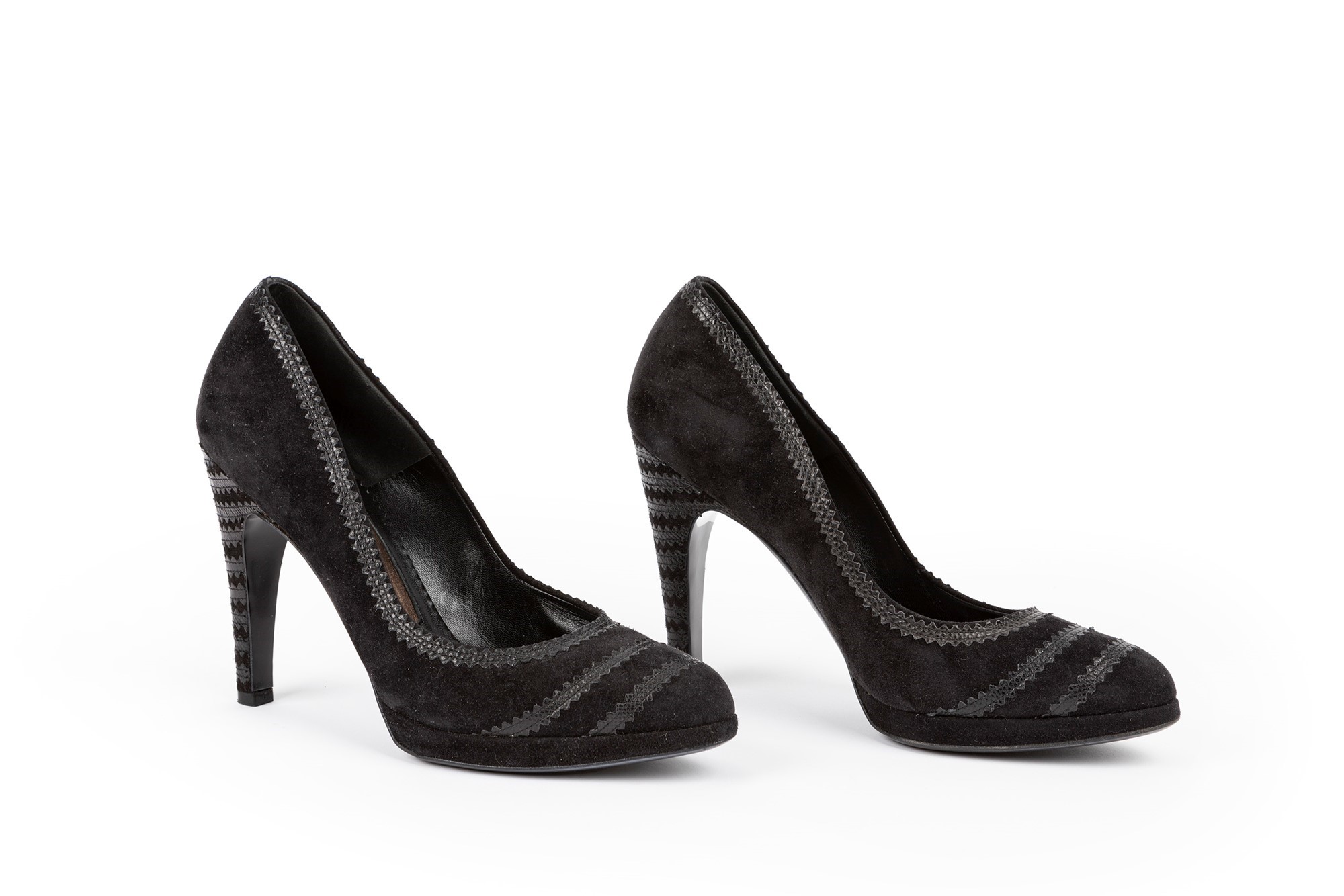 in camoscio color nero con inserti in pelle, tacco cm 11, misura 38,5, con scatola (lievi difetti)