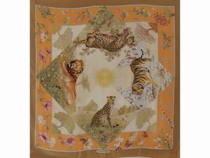 cm 88x84 Anni Novanta in seta stampata con motivo floreale ed animalier su fondo nocciola, bordo a righe gialle [..]
