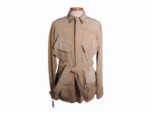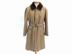 tg 46 in cotone color kaki, interno e collo in pelliccia marrone, corredato di cintura, lievi difetti