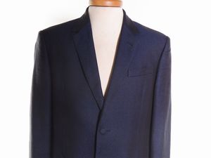 tg 50 in tessuto damascato blu, reverse in velluto, chiusura con unico bottone monogram, lievi difetti