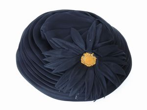 Anni Cinquanta a tesa ampia con seta nera ripiegata su se stessa e grande fiore su un lato, lievi difetti