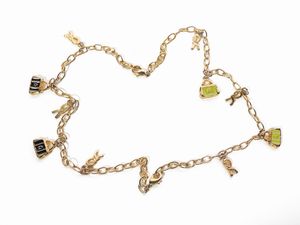 lunghezza totale cm 60 (2) Anni Novanta due cavigliere unibili a collana in metallo dorato, charms monogram ed [..]