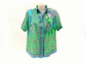 tg 44/46 Anni Settanta in cotone con stampa fantasia geometrica nei toni del verde e azzurro