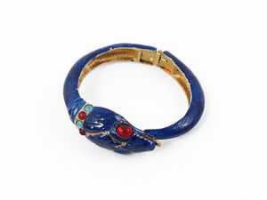 diam. interno cm 5 Anni Sessanta a forma di serpente, smaltato di blu e ornato da cabochon in vetro rosso e turchese, [..]