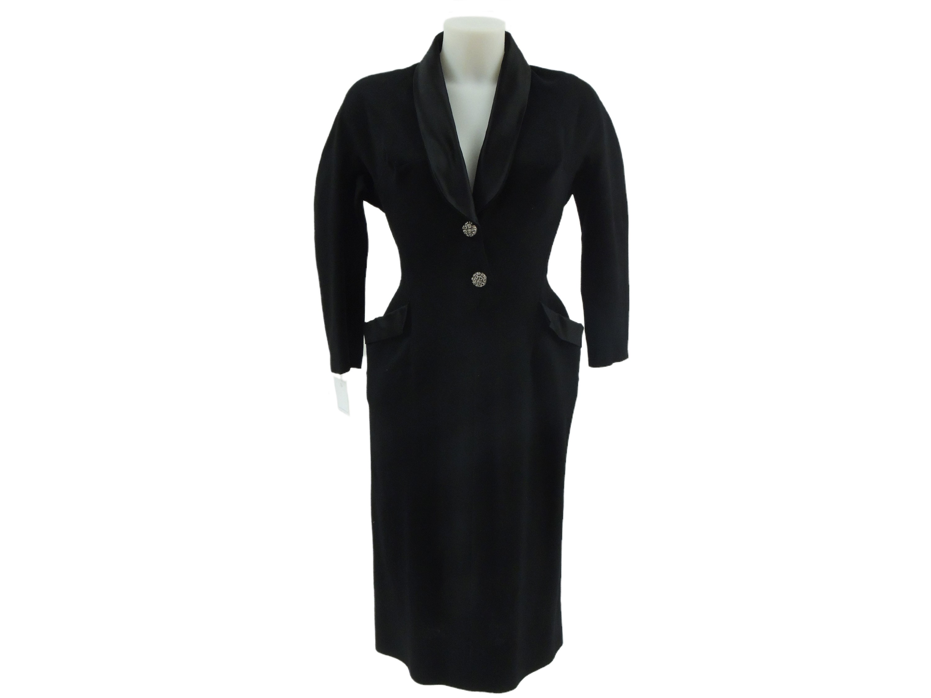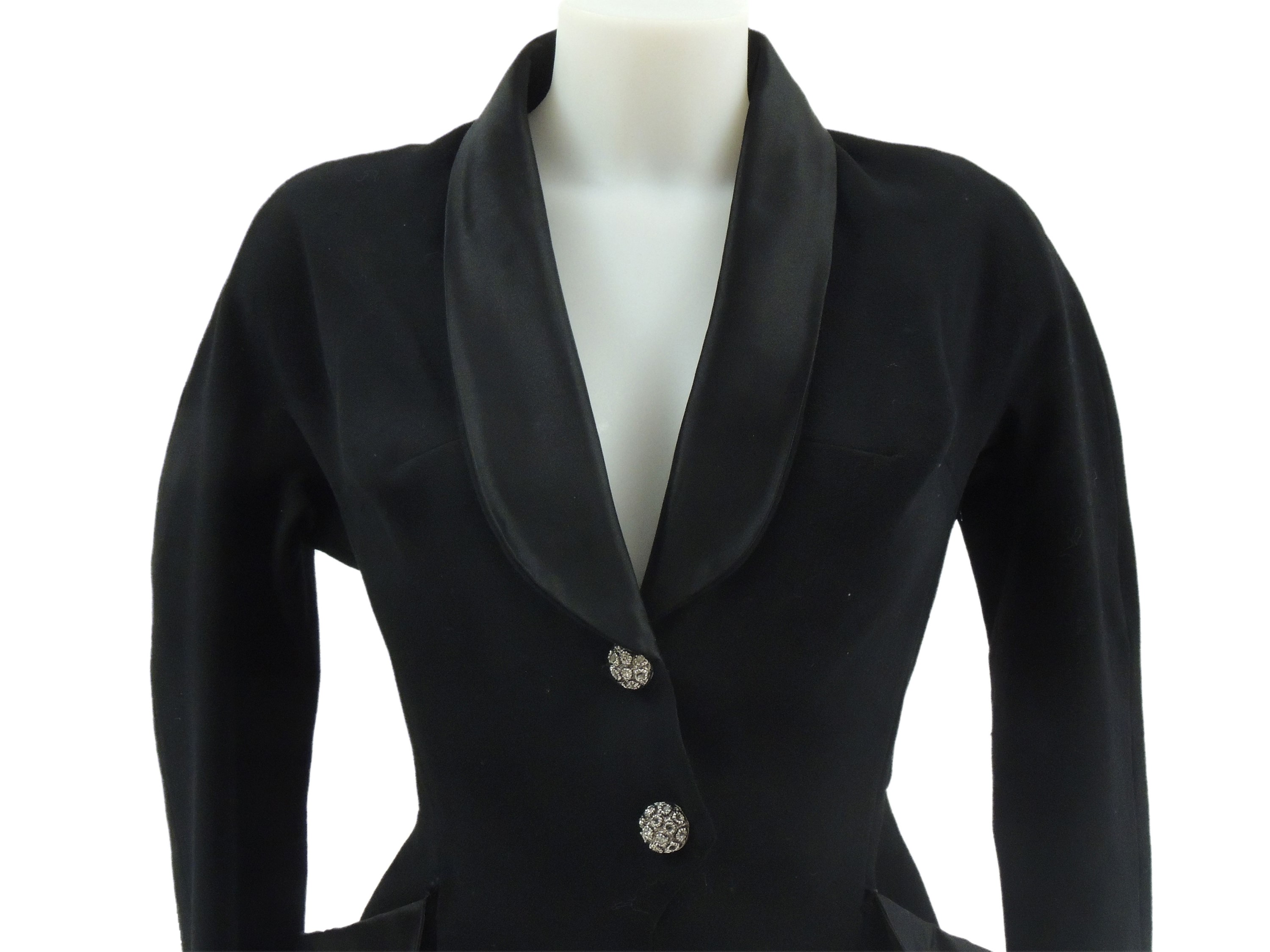 Anni Cinquanta/Sessanta reverse in seta nera, ampio scollo chiuso da due bottoni gioiello, alcuni difetti