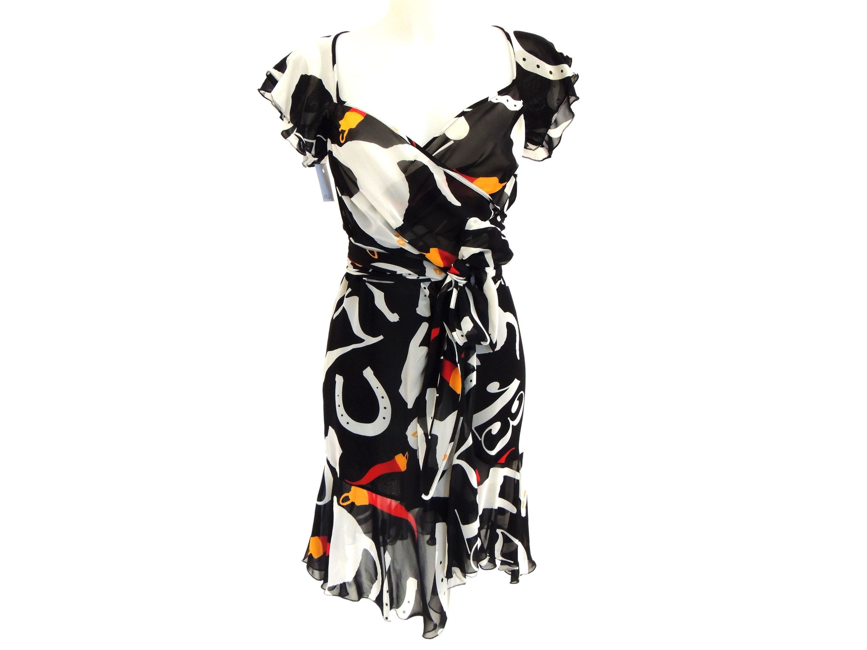 Anni Novanta tessuto bianco e nero con stampa di cornetti rossi, modello incrociato con cintura a fascia per la chiusura