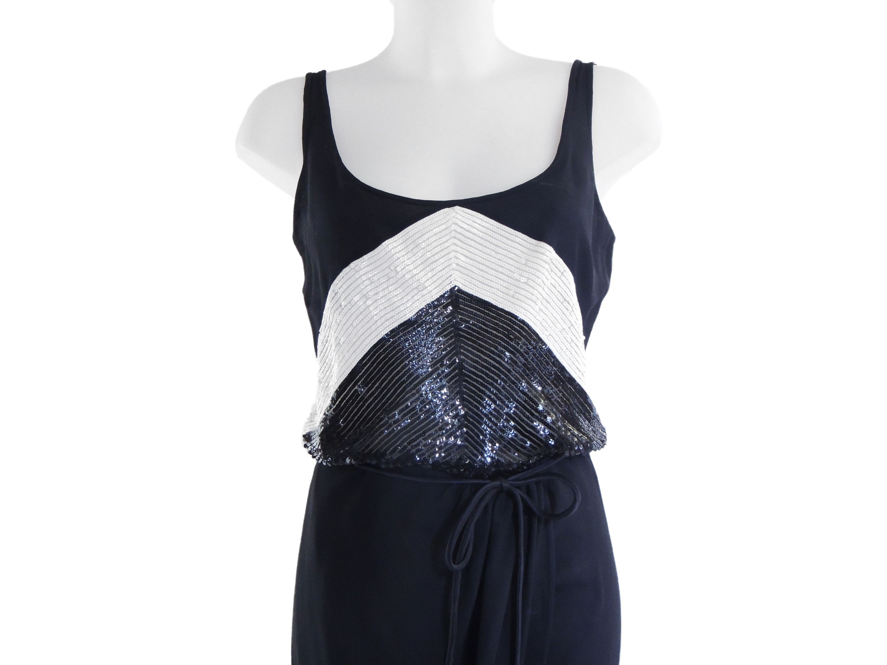 corpetto ornato da paillettes bianche e nere, gonna a portafoglio, lungo cordoncino in raso nero come cintura, lievi difetti