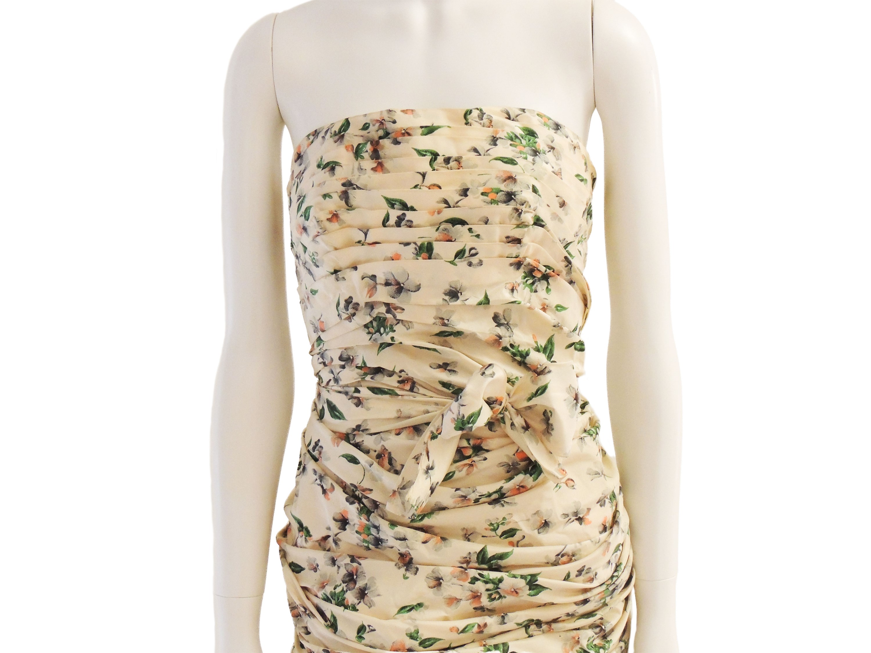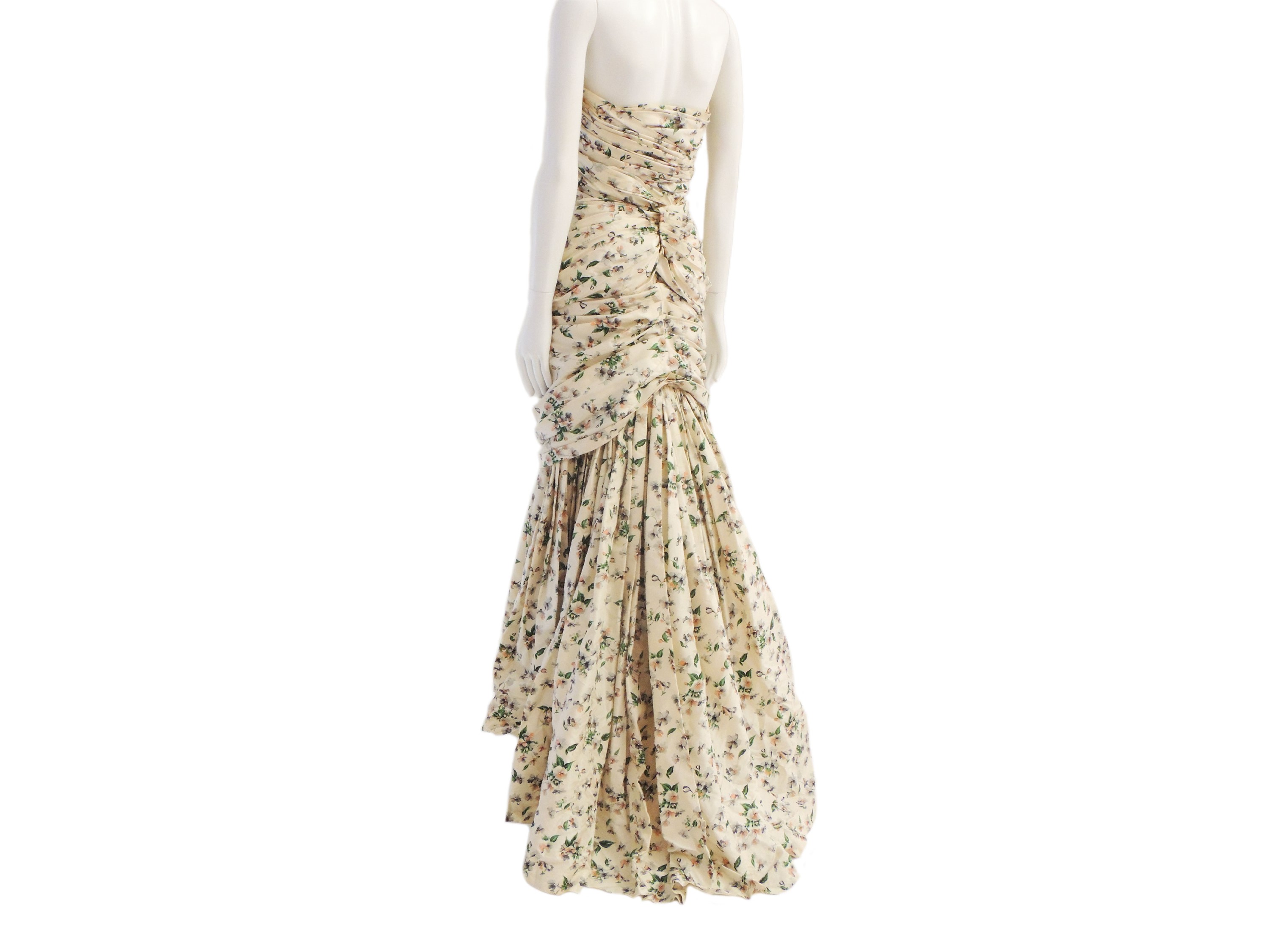 Primi Anni Cinquanta in seta a stampa floreale su fondo avorio, tessuto plissettato, modello d'ispirazione ottocentesca con coda sul retro, corpetto senza spallini, difetti e mancanze