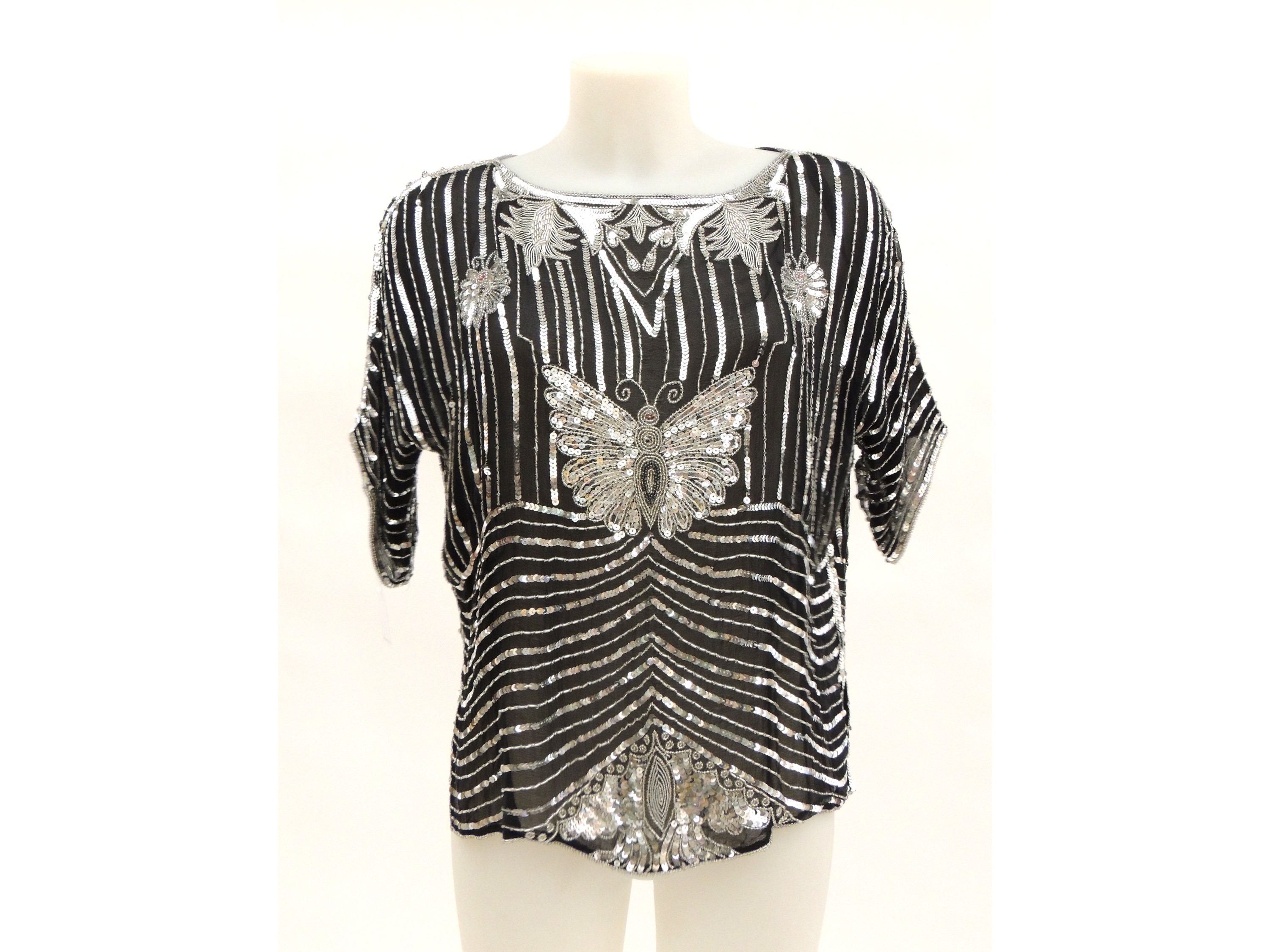 Anni Ottanta in seta nera ornata da perline e paillettes argentate composte a righe e con motivo di farfalle, lievi difetti