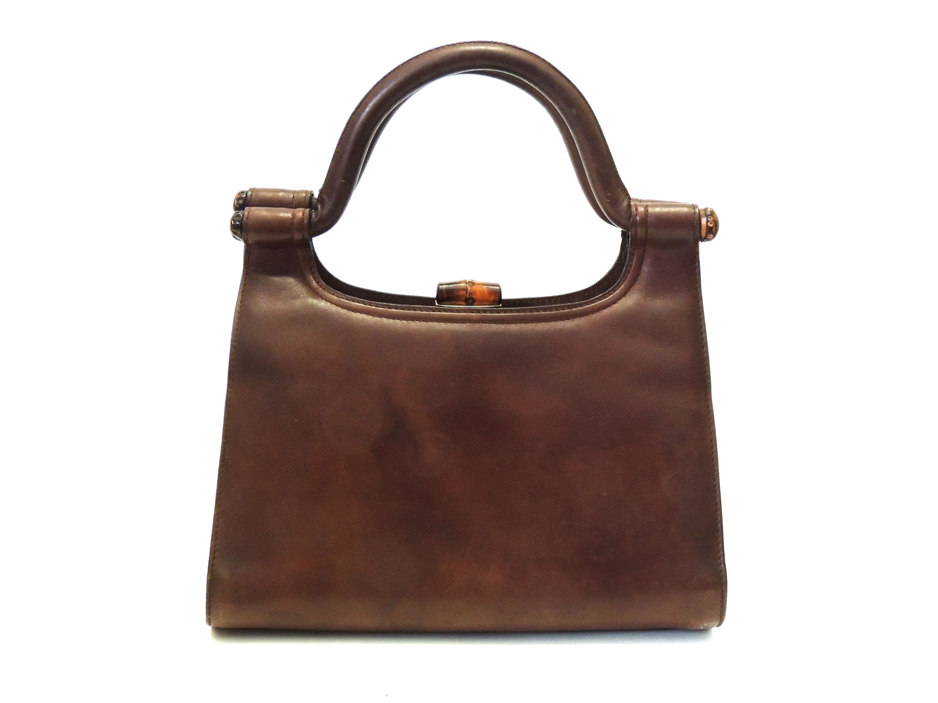 Anni Cinquanta in pelle marrone, apertura e dettagli dei manici in bambù naturale, tre scomparti interni, quello centrale con tre taschini, alcuni difetti e segni d'uso
