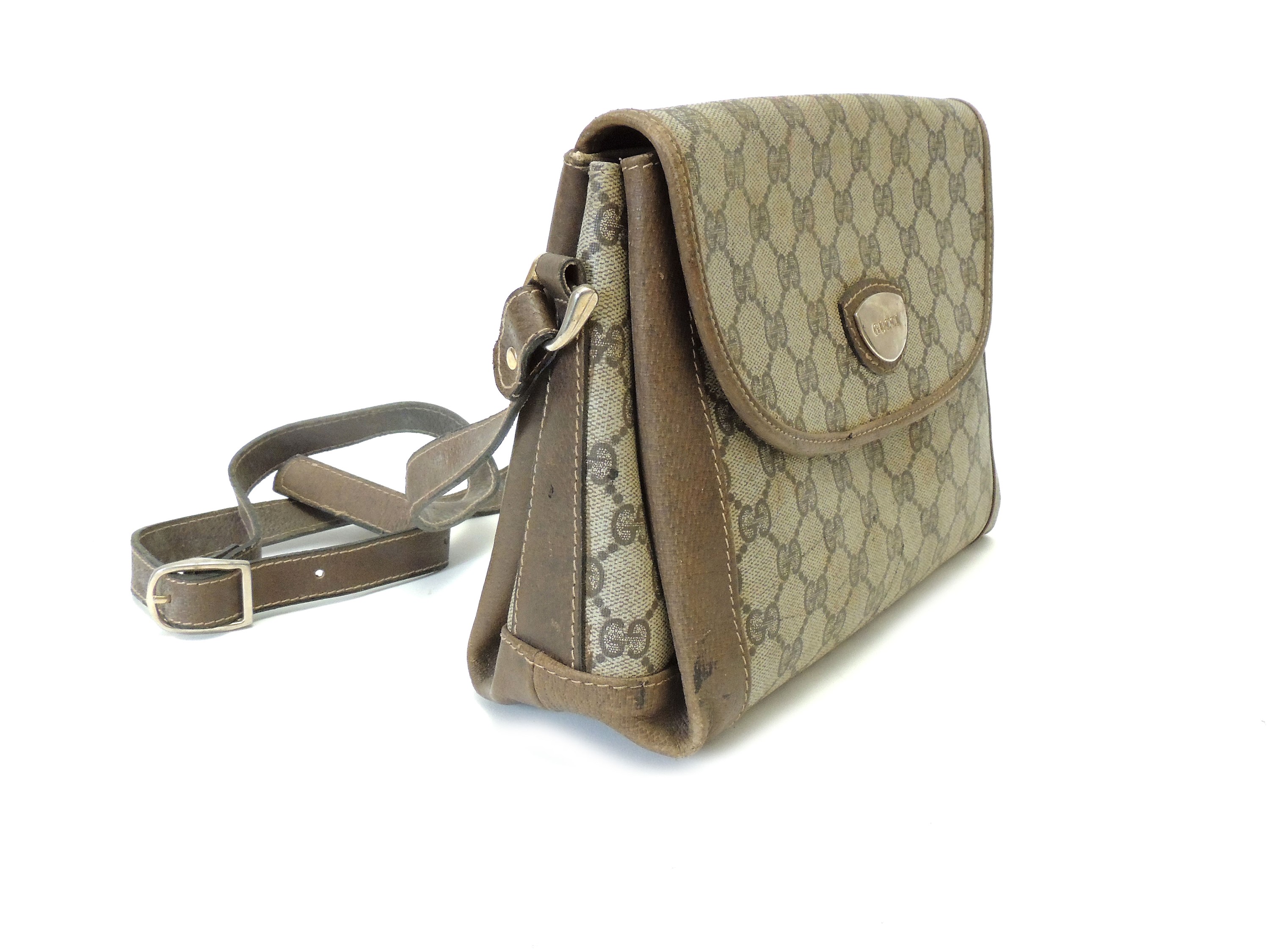 Primi Anni Ottanta in tela monogram marrone, profili e tracolla in cinghiale, interno in pelle beige con tre scomparti ed un taschino, logo interno Gucci con scudo e scritta Accessory Collection, difetti e macchie